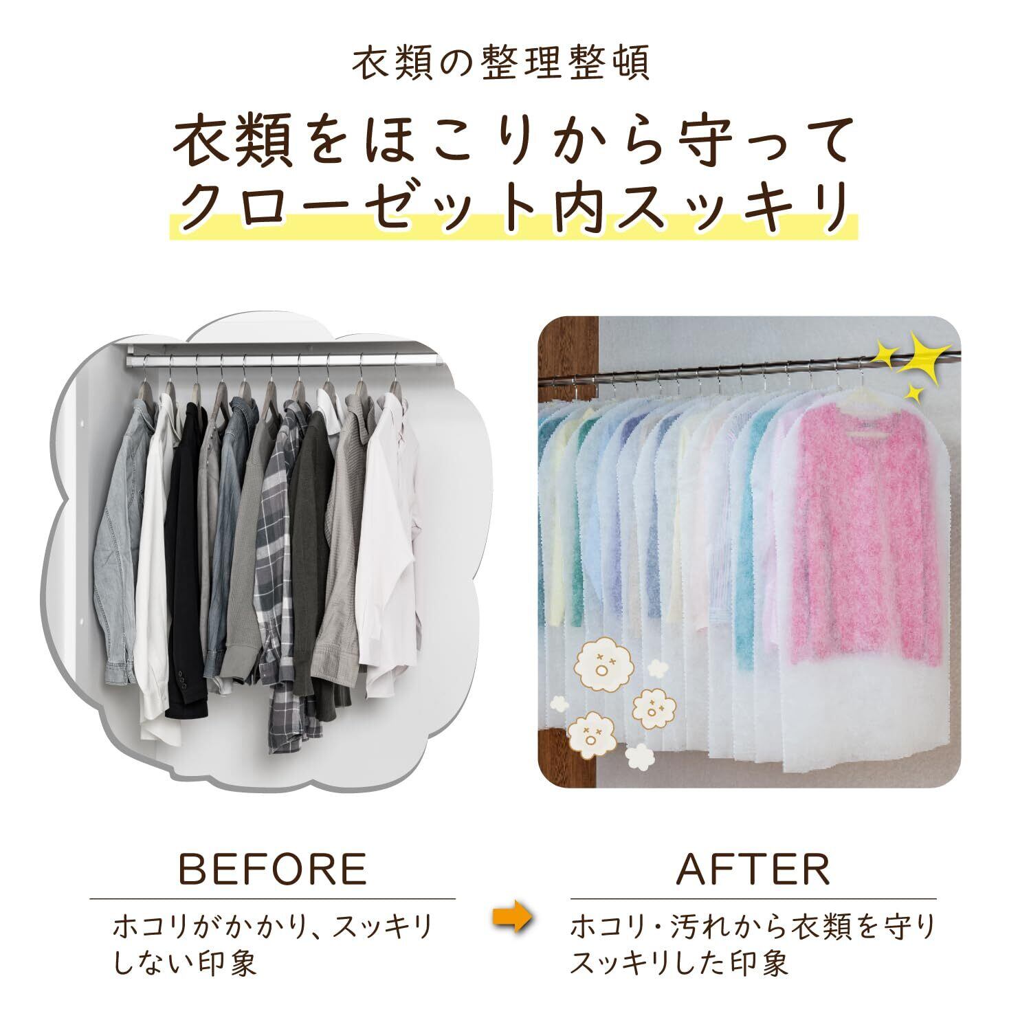 【洋服の上から被せるだけクローゼットがスッキリ】:ハンガーに掛けた洋服の上から被せるだけの簡単カバー。クローゼットがスッキリ。
