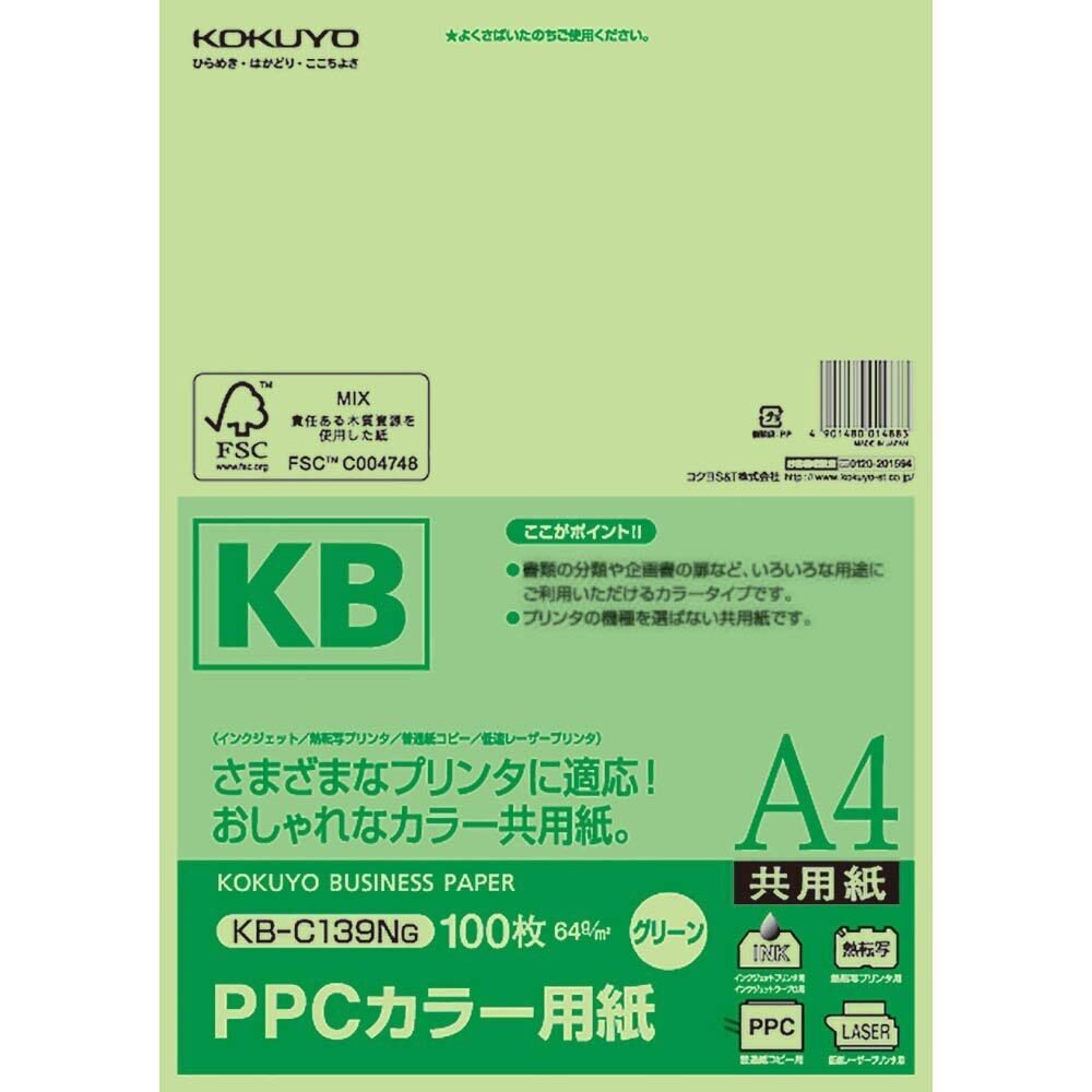コクヨ(KOKUYO) コピー用紙 PPCカラー用紙 共用紙 FSC認証 100枚 A4 緑 KB-C139NG