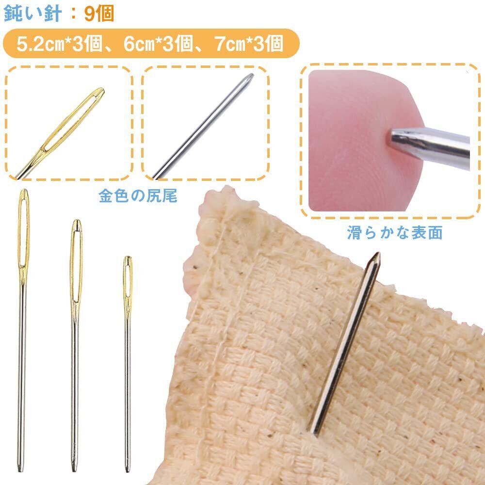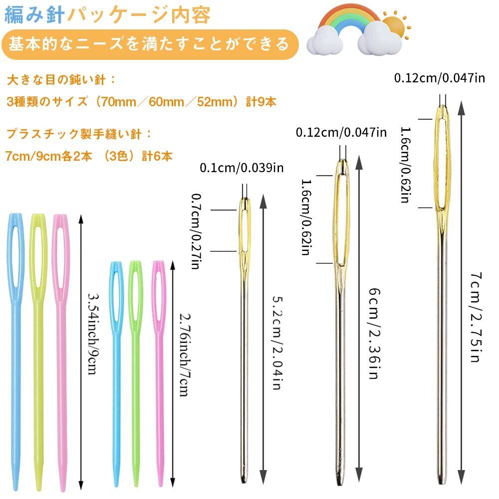 セット内容:プラスチック製手縫い針:7cm/9cm各2本 (3色)計9本 大きな目の鈍い針:3種類のサイズ(70mm/60mm/52mm)計9本 プラスチック製手縫い針カラー:ピンク、ライトブルー、ライトイエロー 大きな目の鈍い針:長穴部分は金色です。