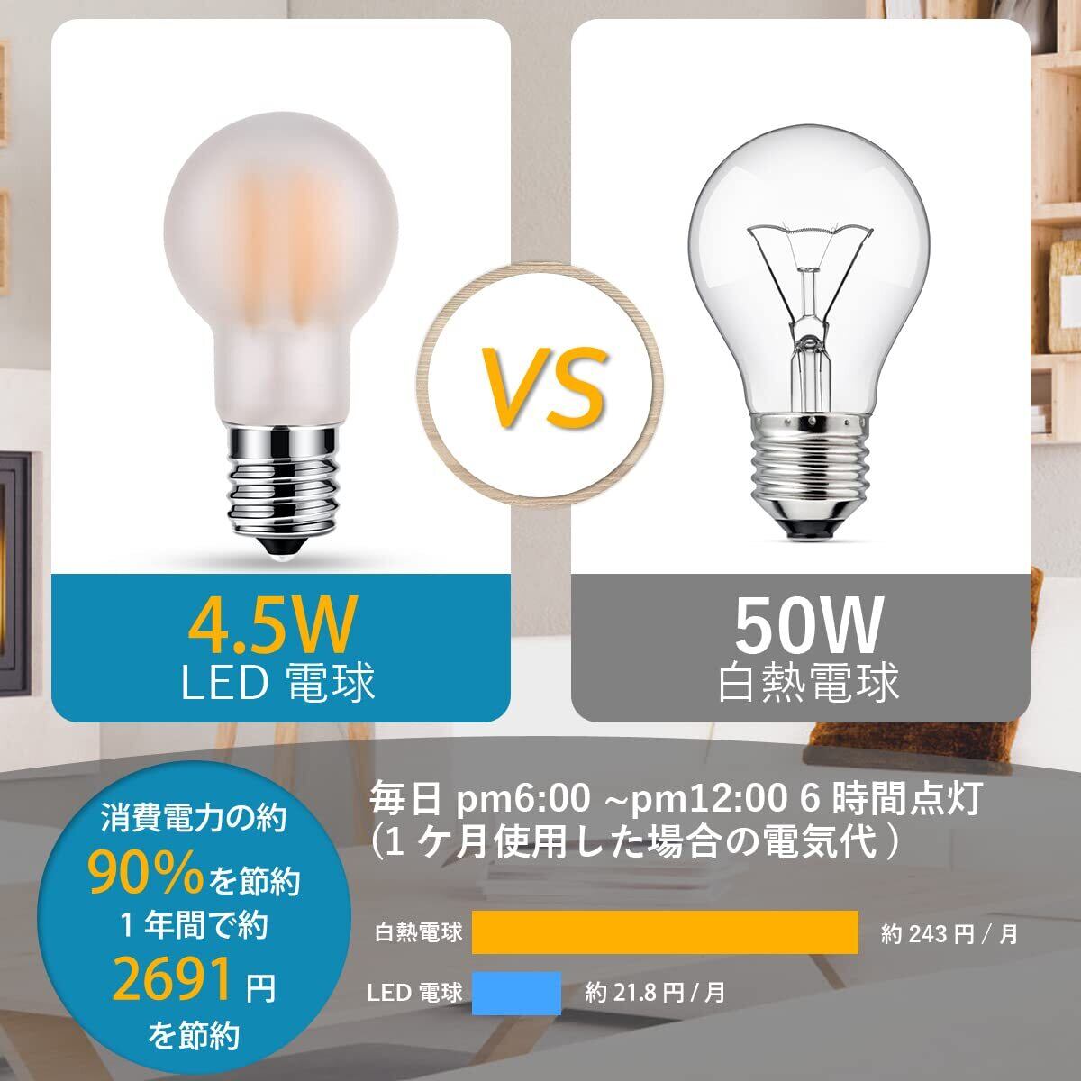 『省エネ』LED電球の消費電力は4.5 W、白熱電球50W形相当、従来の白熱電球に比べて消費電力が低く、90%を超える消費電力を節約し、より少ない熱を発生し、使用寿命を延長し、設計寿命は20000 hで、伝統的なランプ寿命の25倍以上であり、頻繁に交換する必要がない。