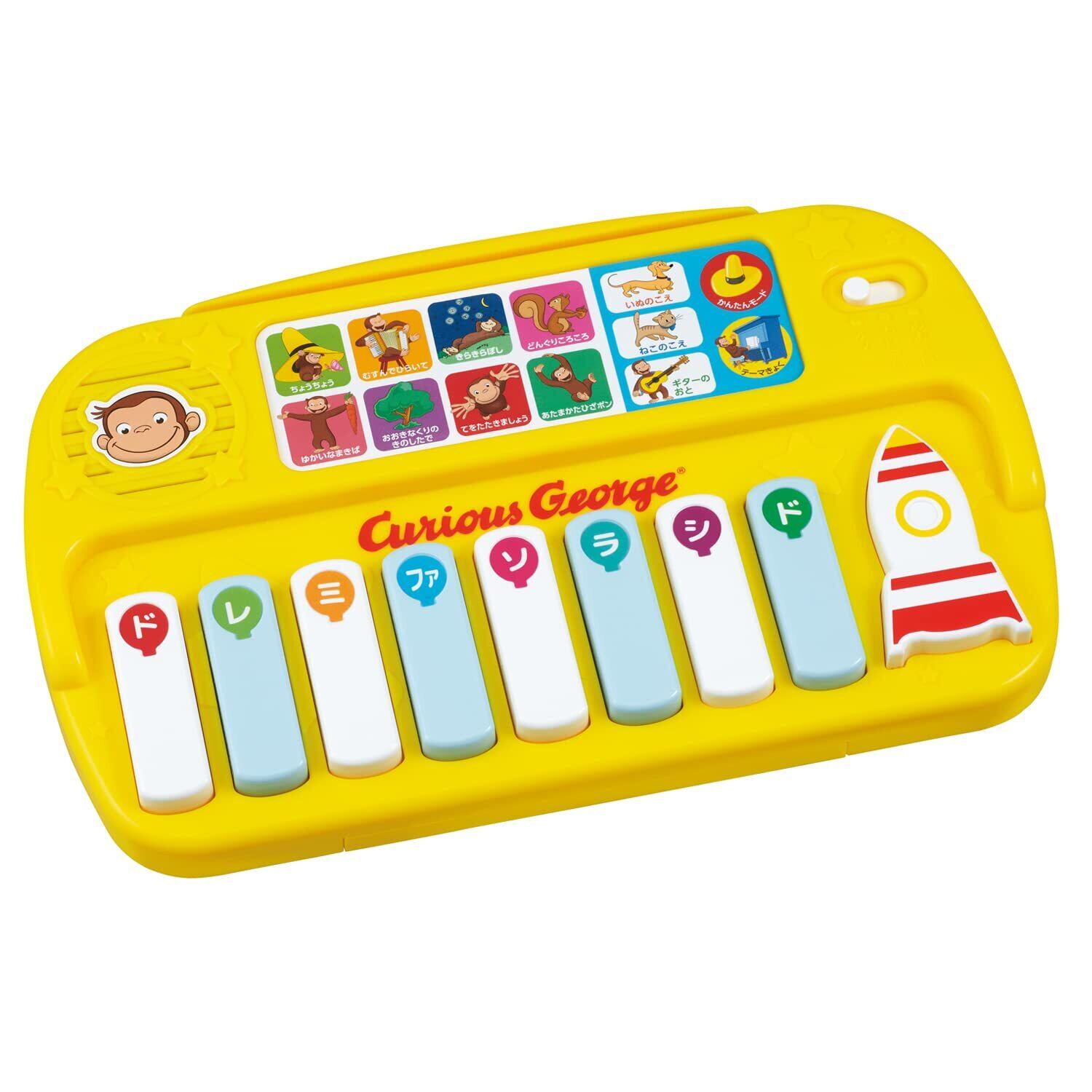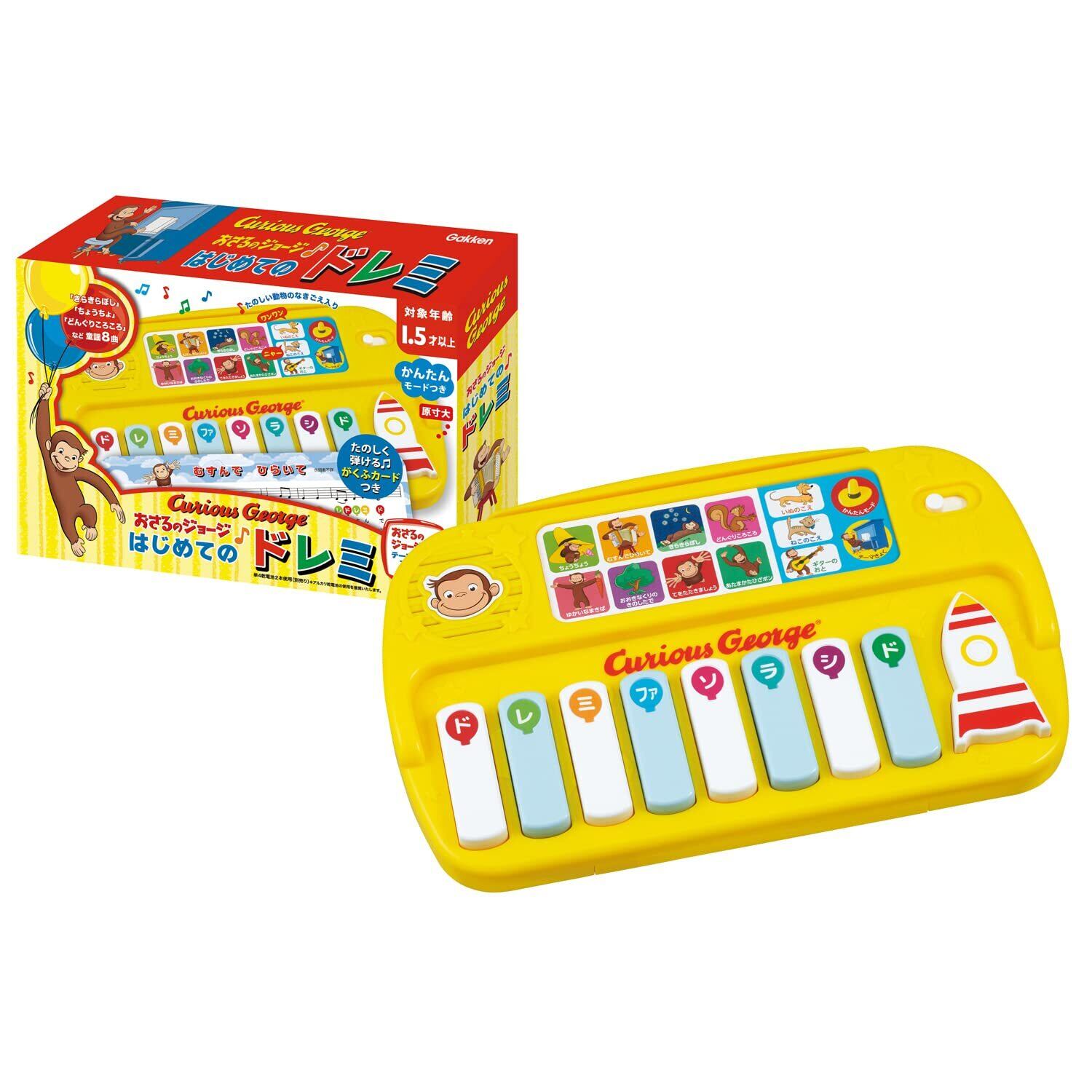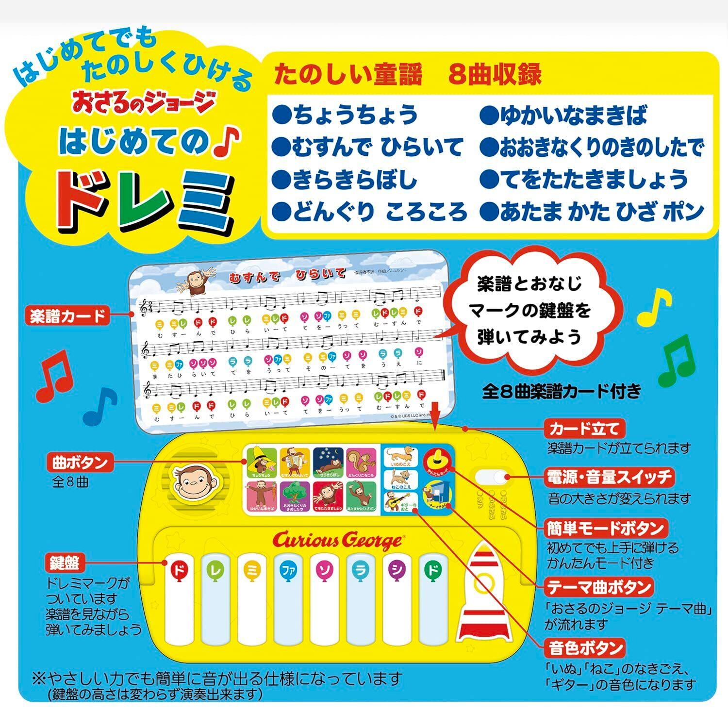 音遊びのファーストトイにおすすめ 「きらきらぼし」や「どんぐりころころ」など童謡8曲を収録した、はじめてでも楽しく弾ける!「おさるのジョージのはじめての ドレミ」。 おさるのジョージと一緒に楽しく音楽に親しみましょう。 初めての音あそびにピッタリ!音楽に合わせて歌ったり手をたたいたり、みんなで楽しく遊べます。 小さい時から音楽や楽器に親しむことは、リズム感が身につくことはもちろん、手指を動かして遊ぶことでお子さまの手先の器用さや集中力を養うことができます。 本体には楽しい童謡8曲入り 楽譜と鍵盤に同じ色の風船が載っていて、色にあわせて鍵盤を押すだけで楽譜が読めなくても楽しく弾けます。 いぬの声やギターの音色に変わる楽しいボタンや、どの鍵盤を押してもその曲が弾ける「かんたんモード」ボタンなど、楽しい工夫がいっぱいです。 楽譜カードを立てかけることができるカード立てや、本体の裏に楽譜カードを収納することができるポケットがあるのも便利なポイントです。 「おさるのジョージ テーマ 曲」も収録されてます。 鍵盤はやさしい力でも簡単に音が出るに仕様です。 ■対象年齢:1.5才以上