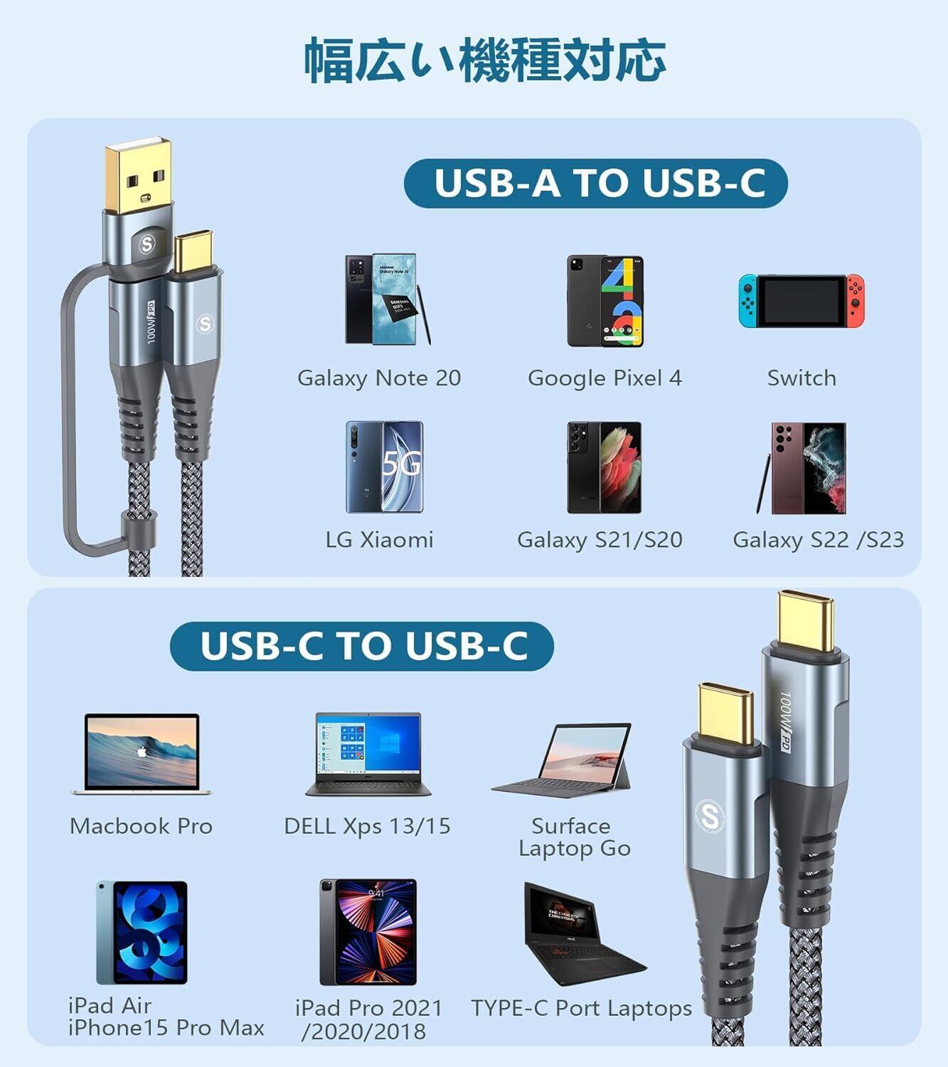 【2in1 デザイン】usb type a/usb type cとusb type c のインタフェースが同時にが備えているケーブル。多種のケーブルを持つ必要がありません、手間をかけずに、生活はより便利になれます。