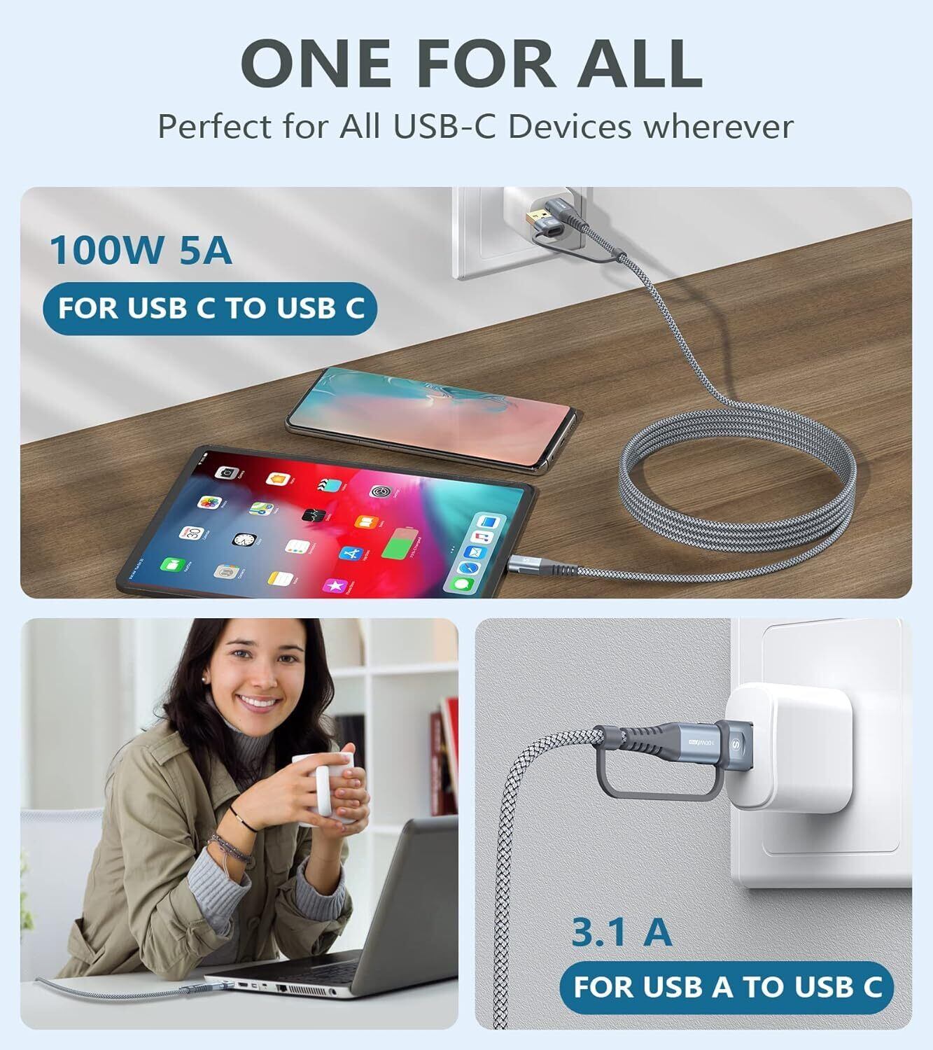 AviBrex 2in1 USB Type C ケーブル 1M, USB-A/USB-C to USB-C ケーブル【100W/5A PD& QC4.0対応 急速充電】 タイプc 充電ケーブル iphone15/アイホン16 シリーズ,MacBook Pro/iPad Pro,Galaxy S24 S23 S22、Sony,Pixel その他usb c機器と互換性があり (グレー)