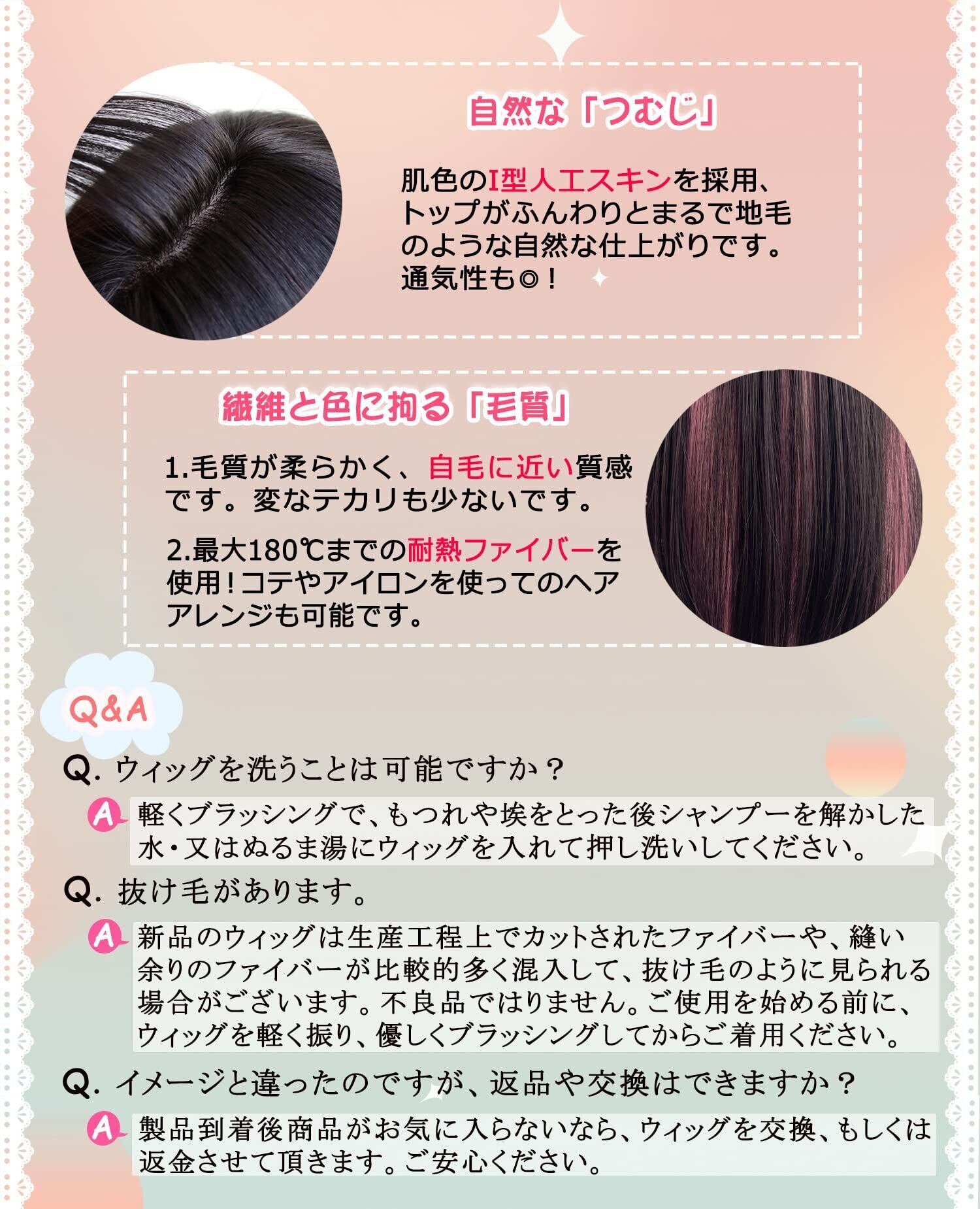 【素材構成】約180度耐熱ファイバー。ドライヤー、コテ、アイロン等で好みの髪型に整えることができます。人工毛特有の光沢がなく自然なツヤがでます。髪質もしなやかで柔らかく肌に当たっても安心。