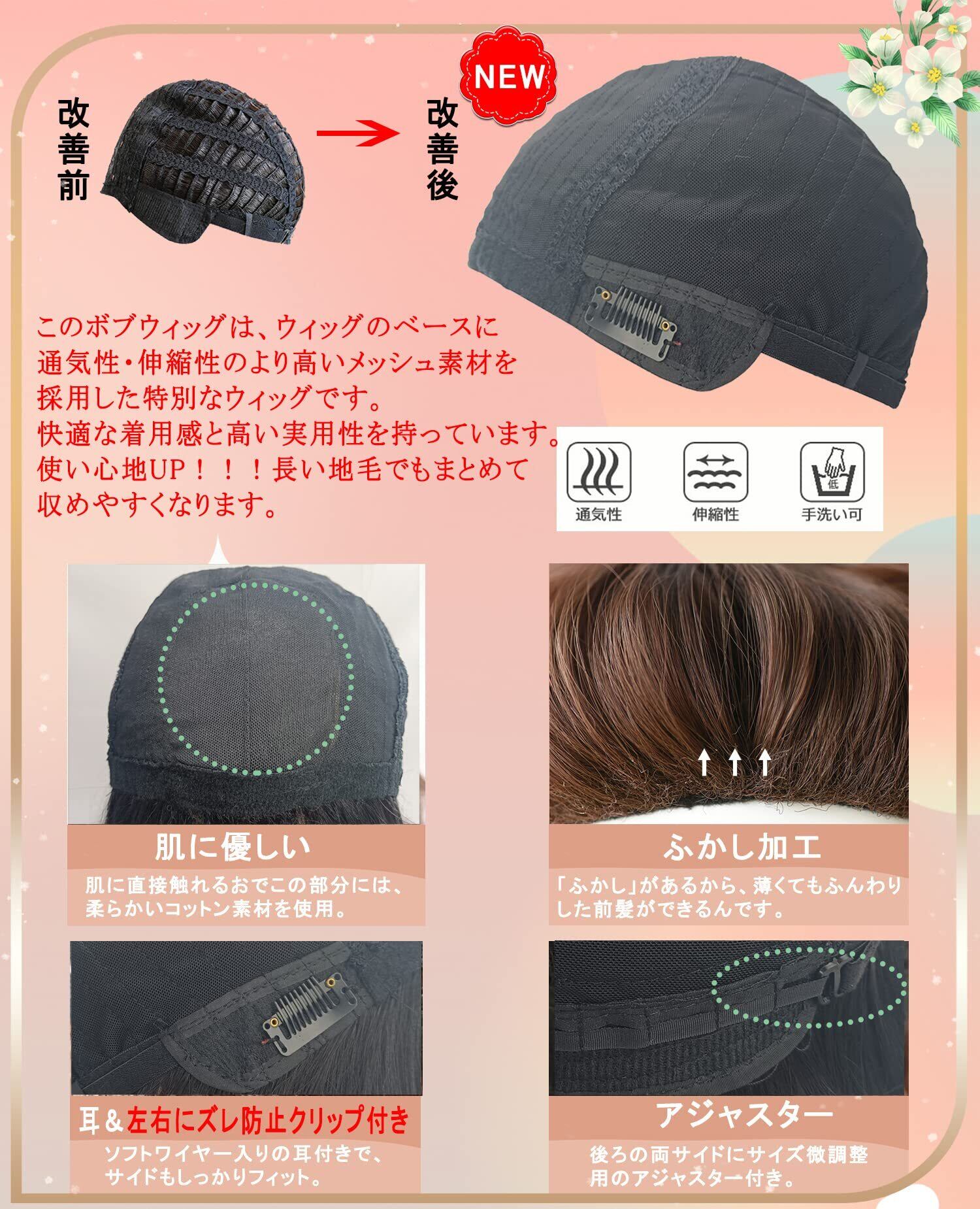 【快適に過ごせる改良「キャップ」】全体は柔らく伸びるメッシュ生地を採用するので、ウィッグの毛が裏側へ入り込みにくくなって、フィット感も大幅にUP!。ズレ防止クリップが付いていて、着用中も安心です。