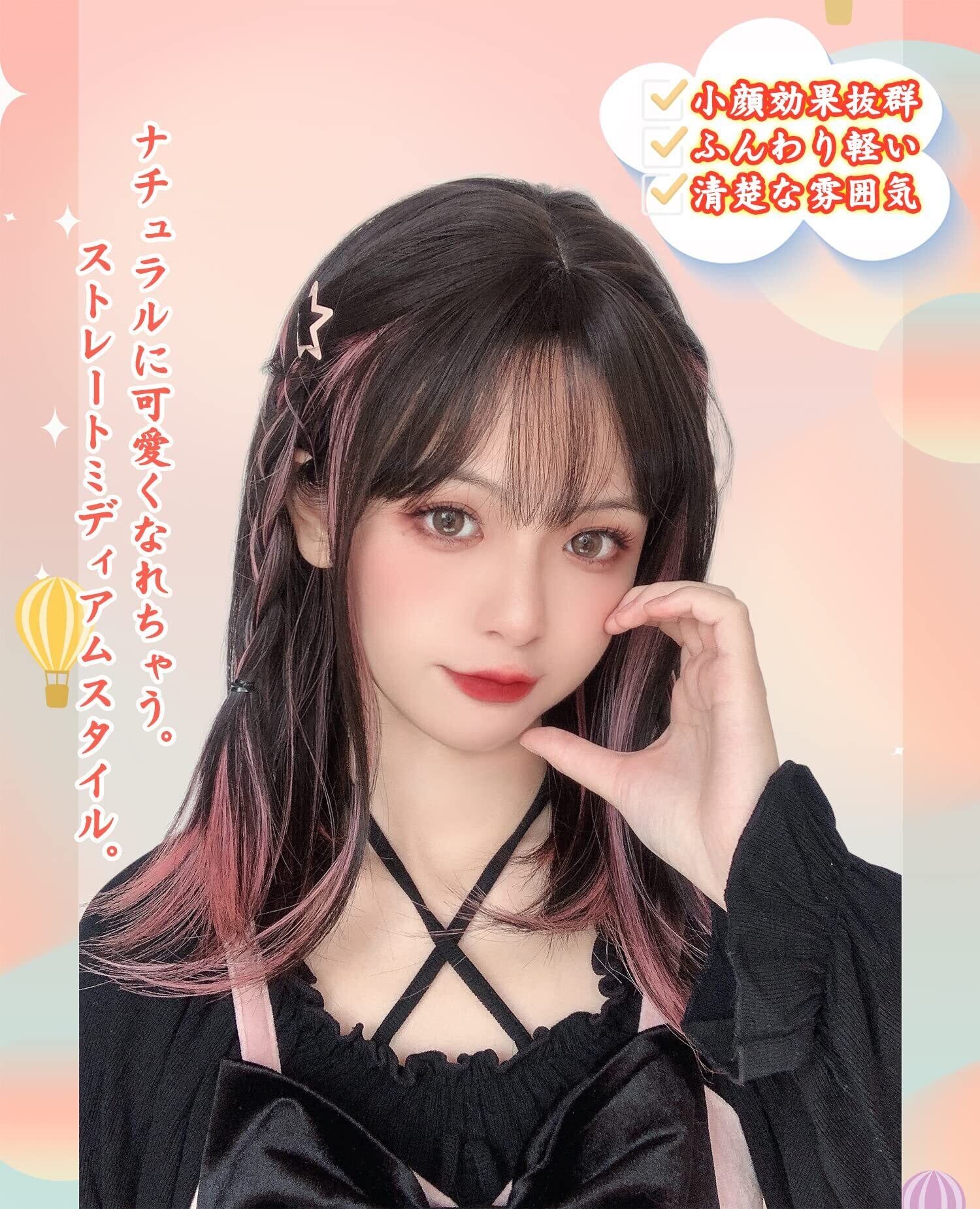Limakaraウィッグ セミロング ストレート インナーカラー ピンク グラデーション ロング ミディアム フルウィッグ ロリータ wig コスプレ サラサラ ぱっつん 女性 小顔 自然 ネット付き ツートンブラックピンク