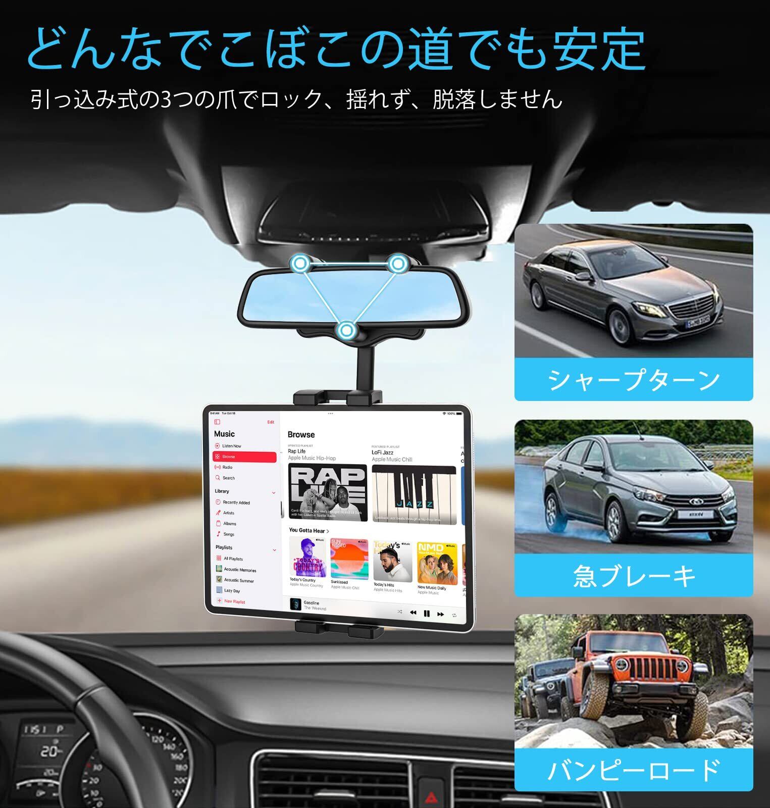 【バックミラータブレットホルダー】このタブレットホルダーは、車のバックミラー用に特別に設計されており、自由に調整して常に道路に目を向けることができます。ナビを見下ろす必要がなくなり、より快適で安全なドライブをお楽しみいただけます。あなたまたは副操縦士の他の人は、ナビゲーション、ビデオの視聴、ビデオ通話の発信、ライブ ストリーミング、ビデオの録画、および運転記録の記録にタブレット カー マウントを使用できます。