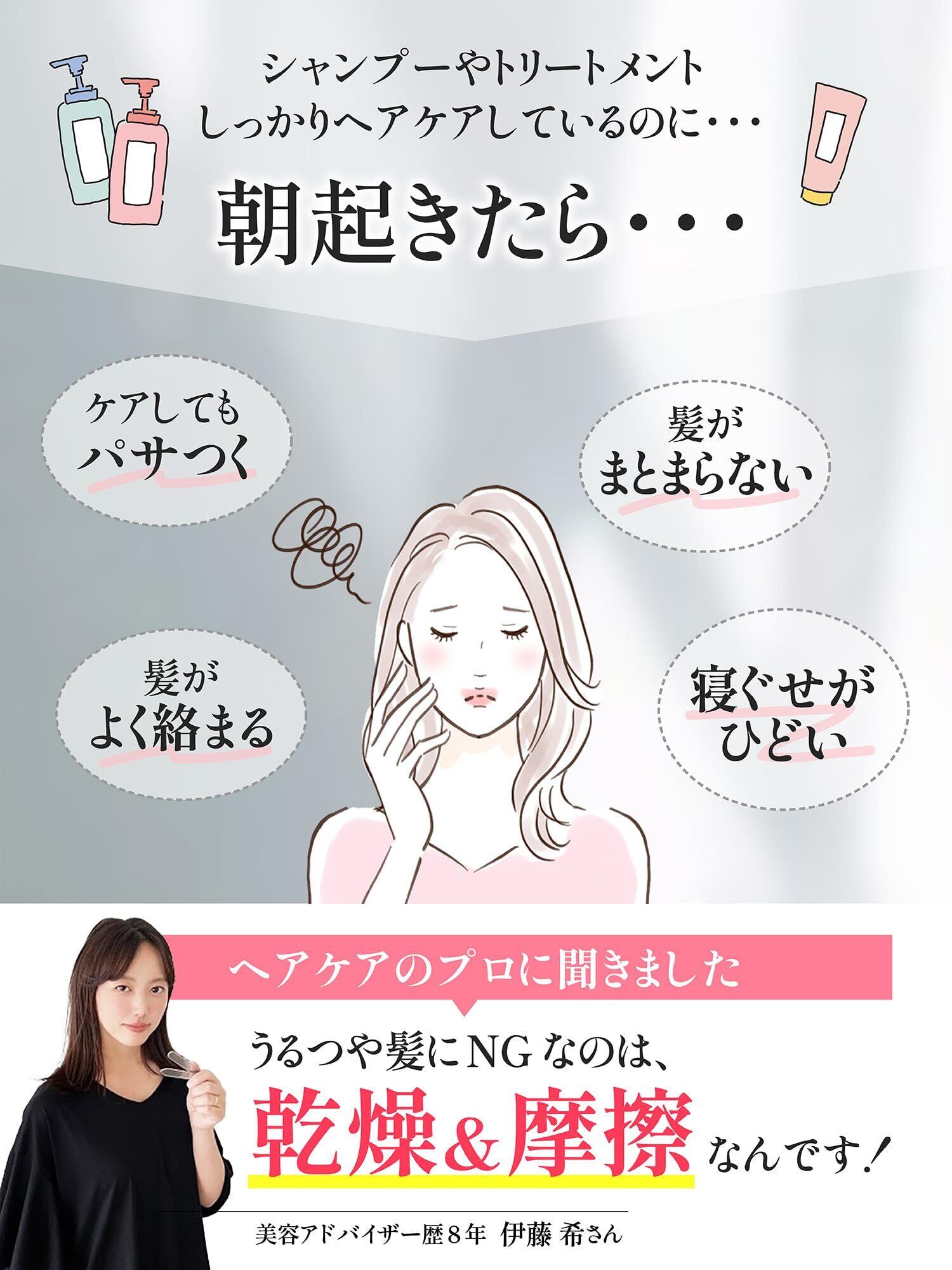 【寝ながらヘアケア】シルク枕カバーに含まれるタンパク質は、枝毛・縮毛・曲がり・乾燥を最小限に抑え、髪と髪の摩擦を軽減する効果があります。シルク枕カバーは長く使っていくうちに、髪が段々柔らかく滑らかになって光沢がでてきたりと髪質改善を実感できます。睡眠中のヘアケアアイテムとして、シルク枕カバーは大人気です。