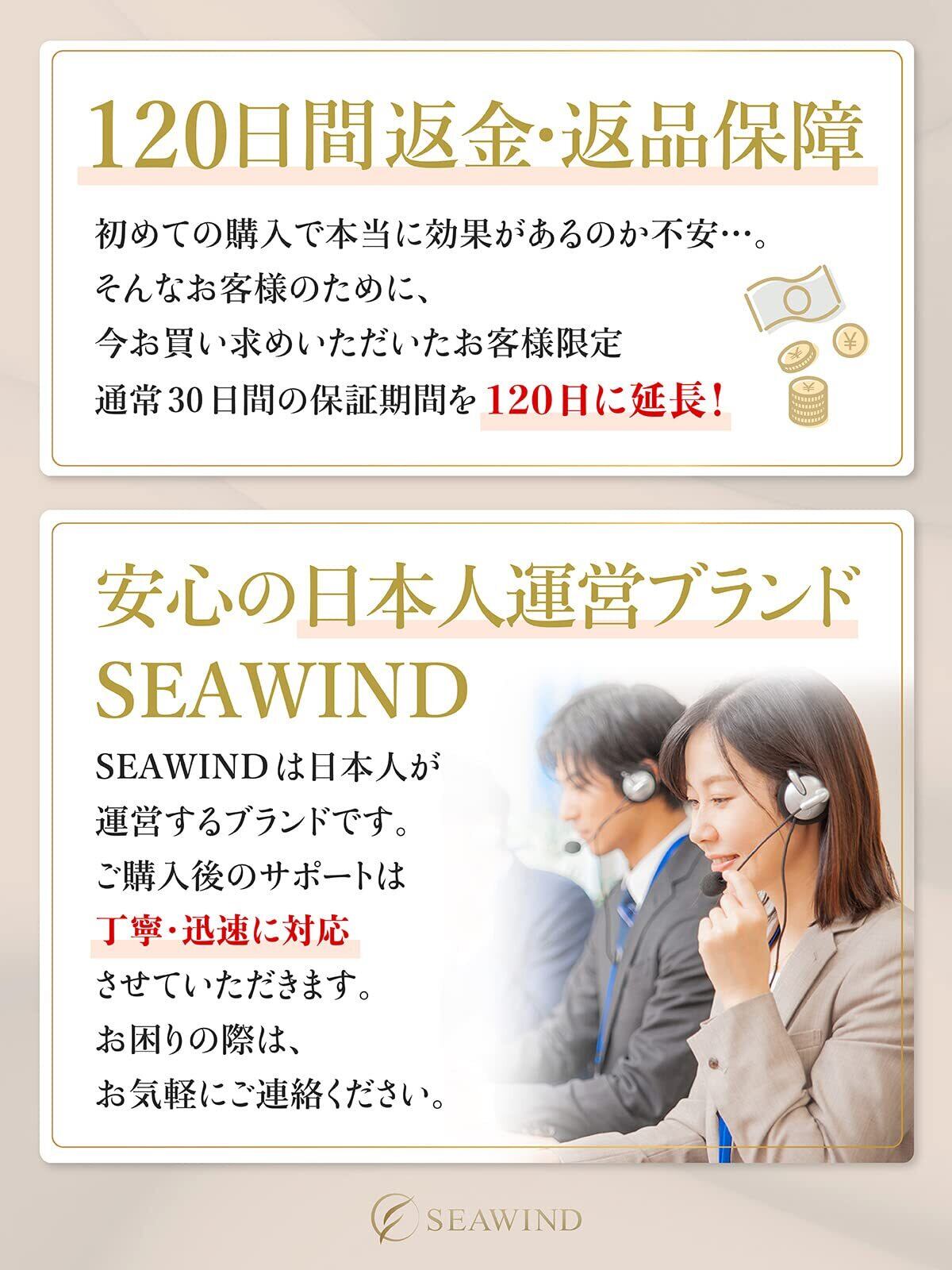 【日本メーカーによる安心!】SEAWINDは日本のメーカーです。万が一商品にご満足いただけない場合は、商品到着日より120日以内であれば、返金・返品対応いたします。 「壊れてすぐだめになった」「購入したメーカーに問合せたら、使い方が悪いと言われた」 そんな心配はもう必要ありません。長くご愛用頂きたいからこその長期です。何かご不明点等ございましたらお気軽にお問い合わせください。