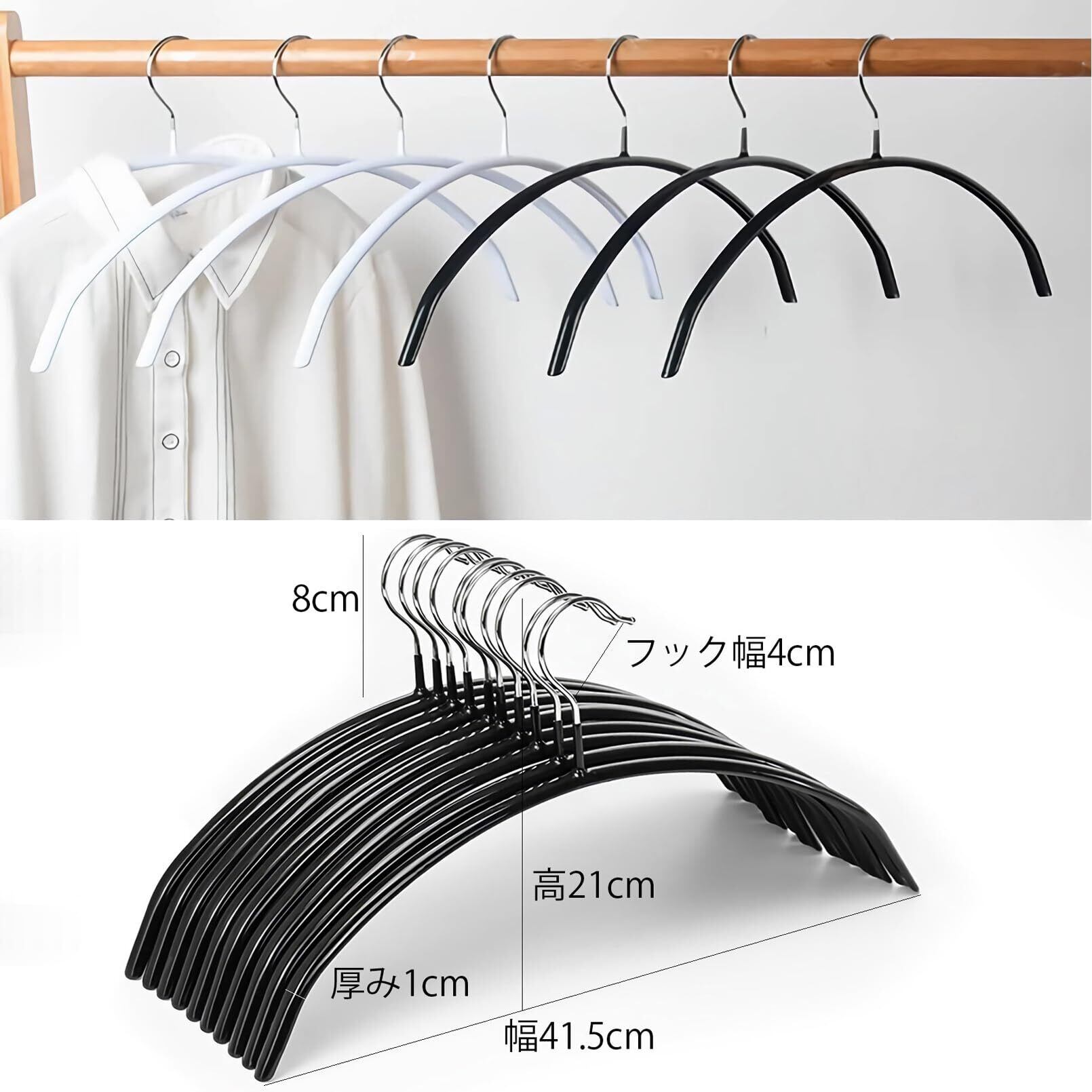 【跡がつかないハンガー】肩先が緩やかなカーブになっているので衣類を引っ張る傷つけません。肩の跡がつかないので衣類の形をきれいに保ちます。