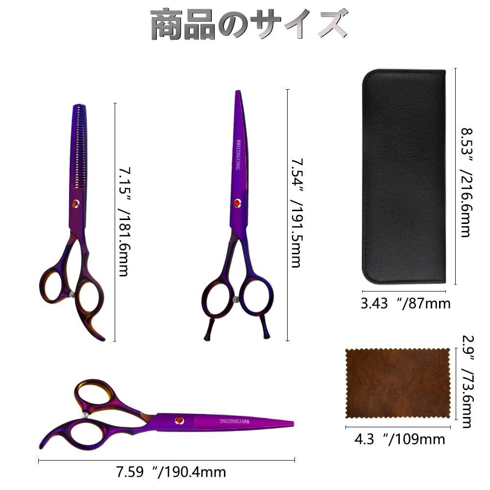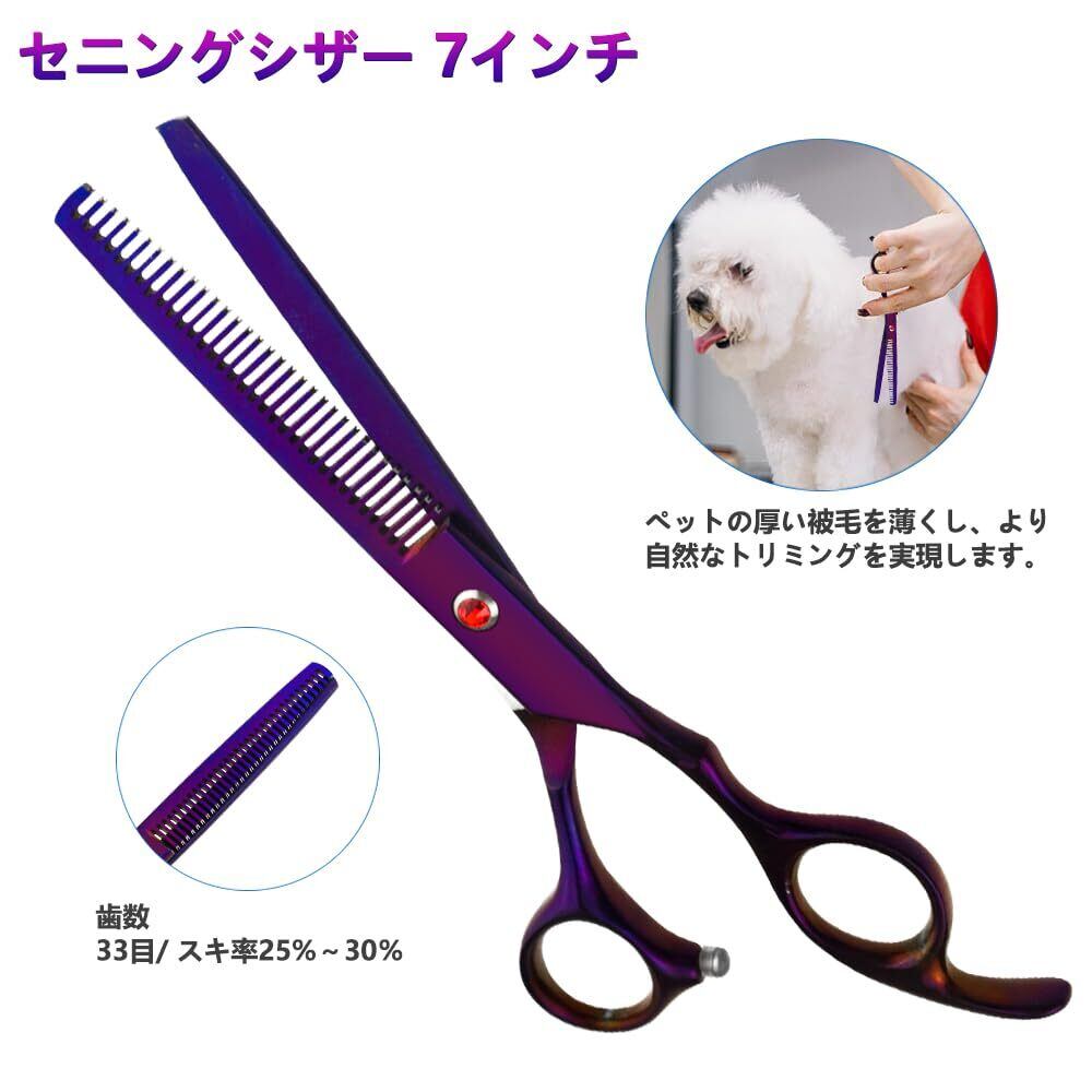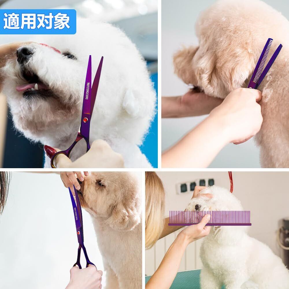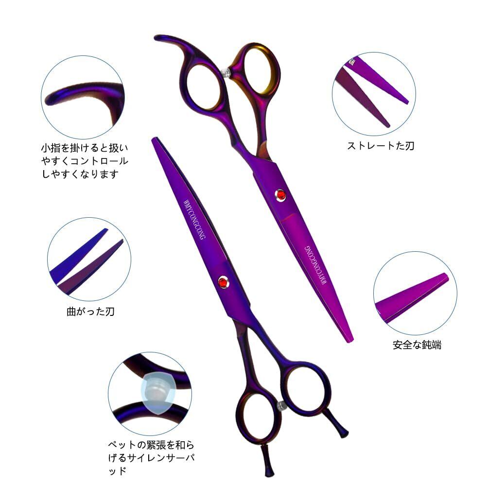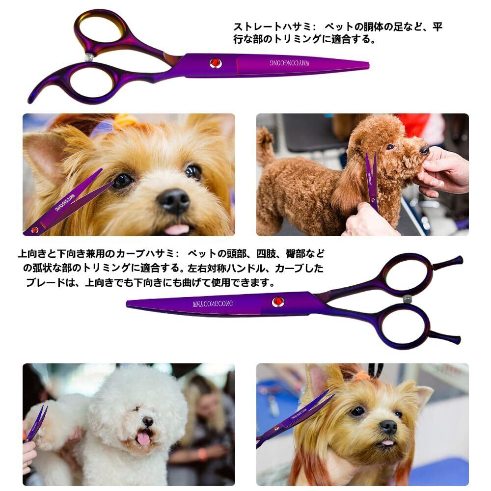 WMYCONGCONG 7インチ プロ トリミングハサミ 犬 猫 高級 トリミングはさみ ペットハサミ セット 6CRステンレス製 ストレートとカーブシザー セニングシザー コーム 全身美容 ペット用品 初心者 プロ用 専用 紫(ケース付き,クリーニングクロス,トリマーさん)