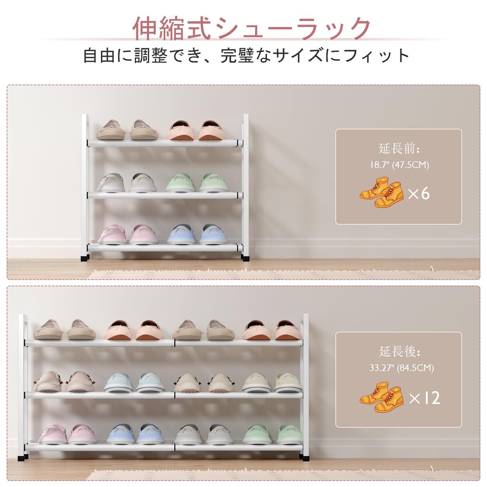 【シューズ収納ラック】この段階調整可能なシューズラックは、幅45〜83cmに調整でき、6〜12足の靴を収納できます。玄関、ガレージ、ベッドルーム、クローゼットをスッキリさせるのに最適な収納ソリューションです。