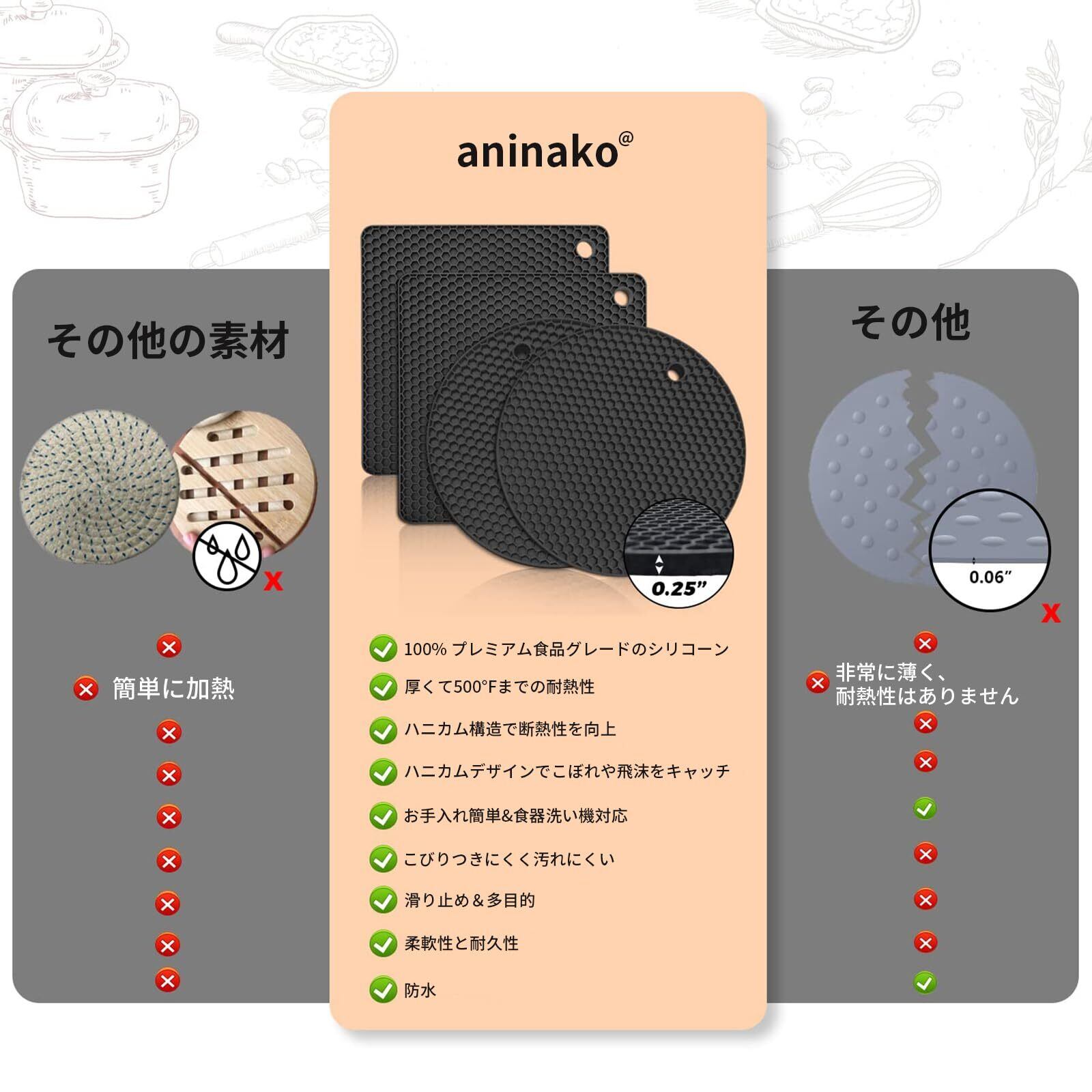 aninako 鍋敷き シリコン 4枚セット (四角2枚+円2枚)耐熱 滑り止め ダイニングテーブル保護 やけど防止 多機能 簡単な洗浄 サスペンション収納可能 (ブラック(4個入り))