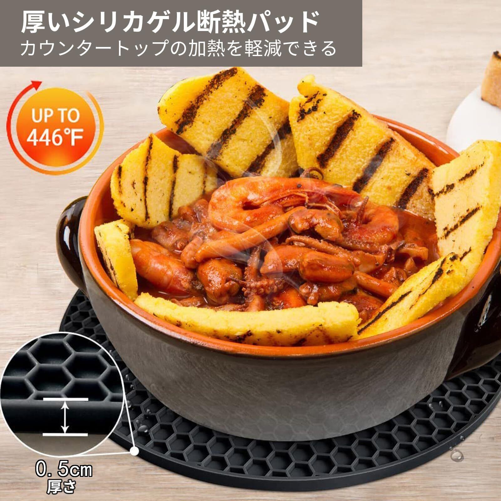 【商品情報】サイズ:18.2cm×18.2 厚さ6mm カラー:ブラック セット内容:4枚セット(四角2枚+円2枚) 【ハニカム構造採用で多用途!】ハニカム構造で滑りにくく、鍋つかみ・瓶のフタ開けとして利用でき、滑り止め効果があります。また、コースターとしても水滴が溢れにくくなっています。 【シリコン製鍋敷きの特徴】弾力性に優れた上質素材を使用、耐熱性能が高いシリコン製マット、熱を放散しやすいハニカムデザイン、伸縮性ばつぐんで破損しにくい、-40℃~230℃までの耐冷・耐熱性。 【高い機能性】フック用の穴付きで収納しやすい、汚れても安心!水洗いOK、柔らかいから鍋つかみにもなる 【使い方いろいろ】土鍋やホーローなどの鍋敷きに、コースターやランチョンマットにもおすすめ、瓶オープナーとしても使えます