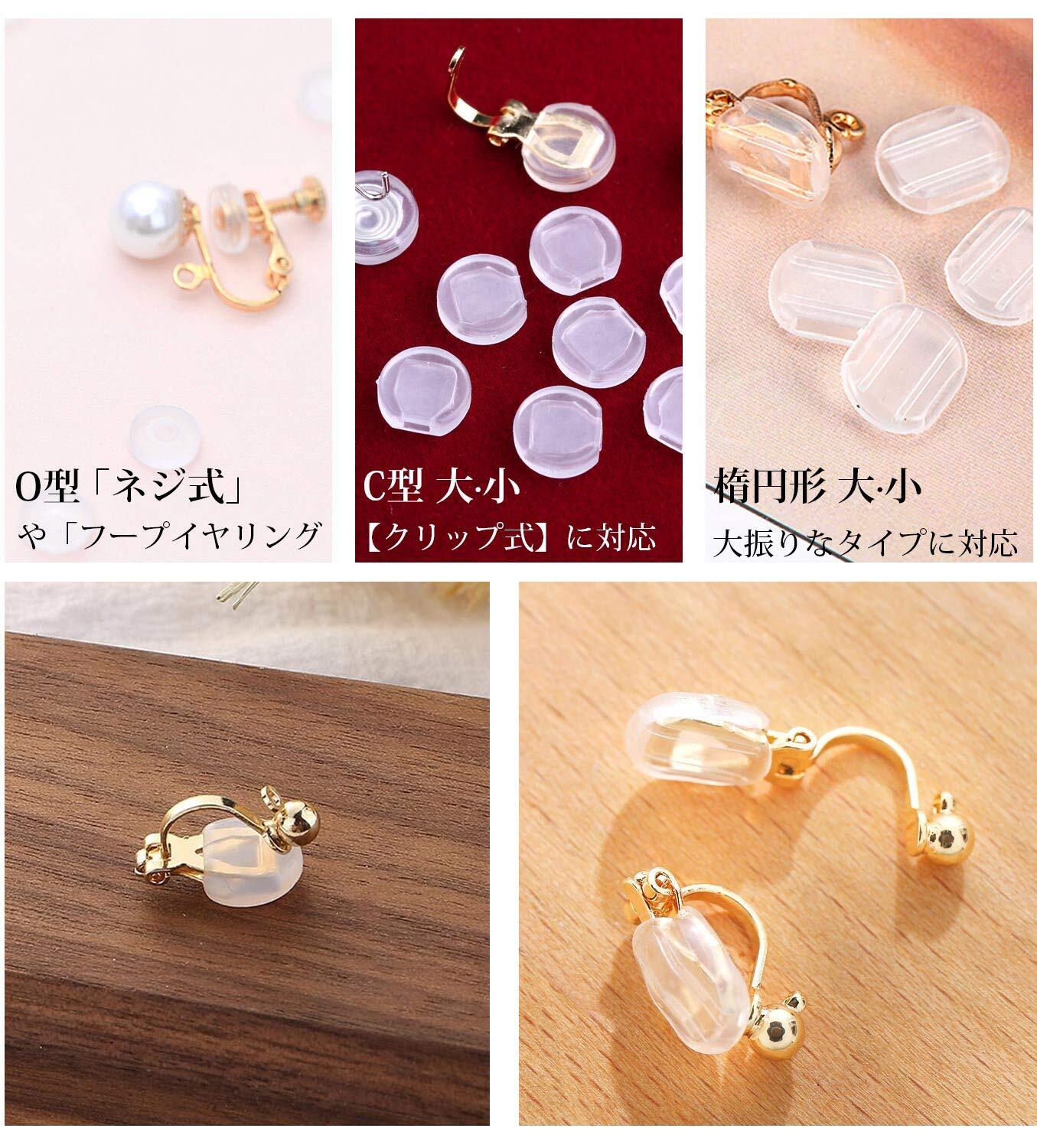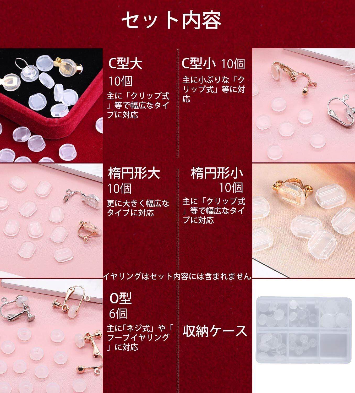 【商品仕様】イヤリングカバー(シリコン製)5種類合計46個セット、C型大/小各10個、楕円型大/小各10個、O型6個、合計46個セットです。収納ケースが付き、イヤリングパーツやちょっとした小物の保管に便利です。