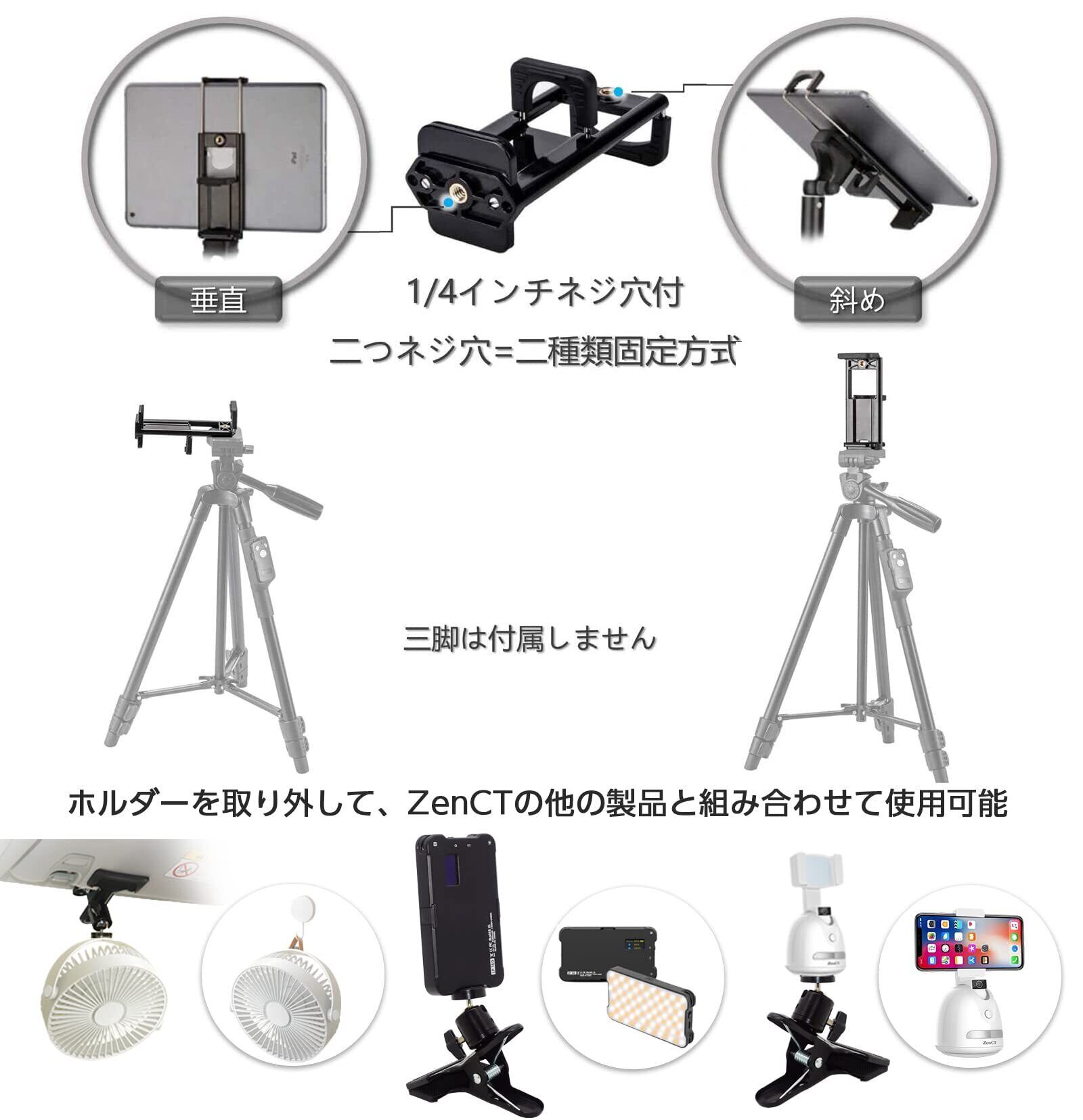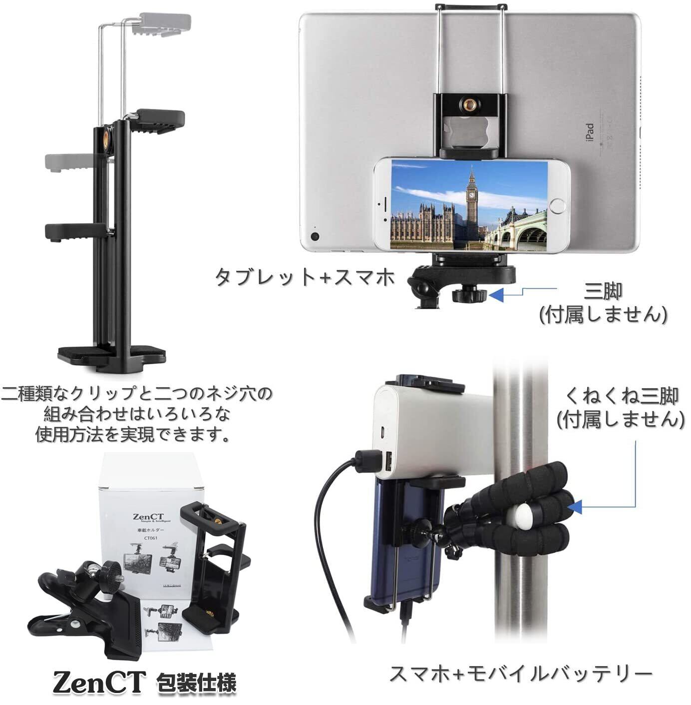 ZenCT 車載ホルダー クリップ式 スマホ/タブレットホルダー iPadスタンド 360度回転 サンバイザーにしっかり固定 後部座席 片手操作 車中泊 多機種対応 4.0-11インチ CT061