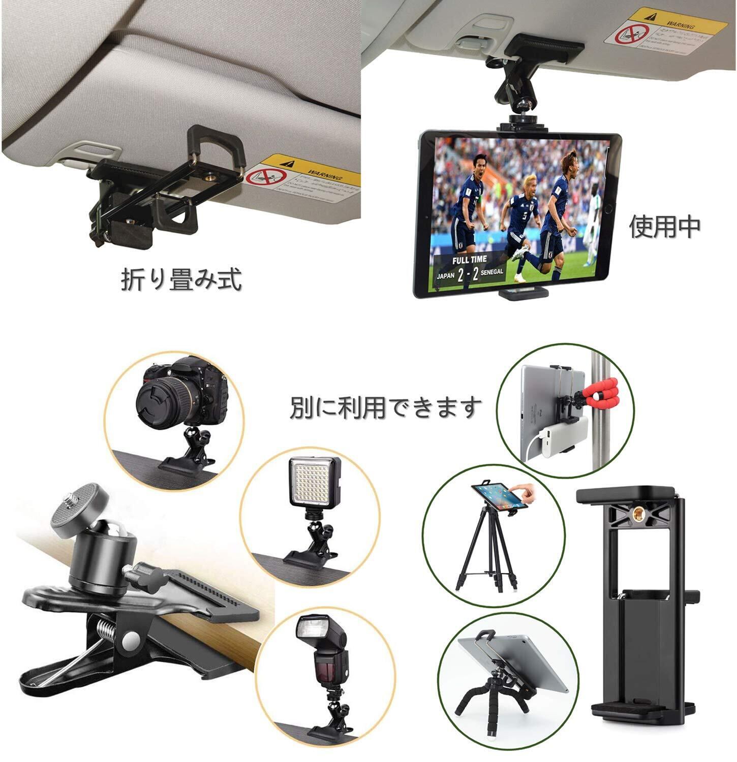 【スマホ/タブレットホルダー】クリップ式な車載ホルダーです。多機種のスマホとタブレットに適応します。車のサンバイザー、後部座席、ダッシュボードのエッジ などに挟んで装着することができます。