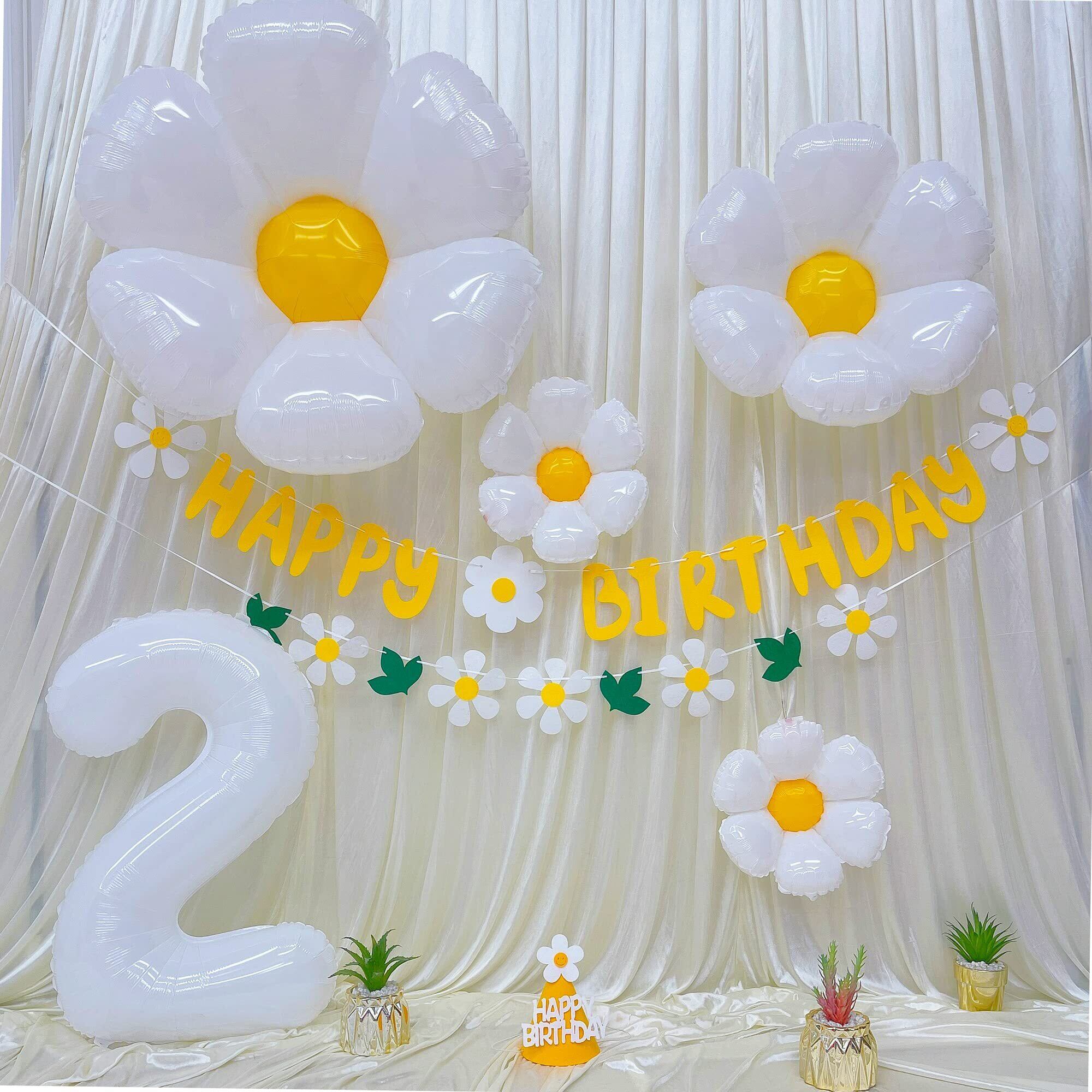 【セット内容】①フェルト布ガーランド×2 ②デイジーバルーン ×4 ③数字バルーン×1 ④三角帽子×1 ⑤リボンひも (10m)