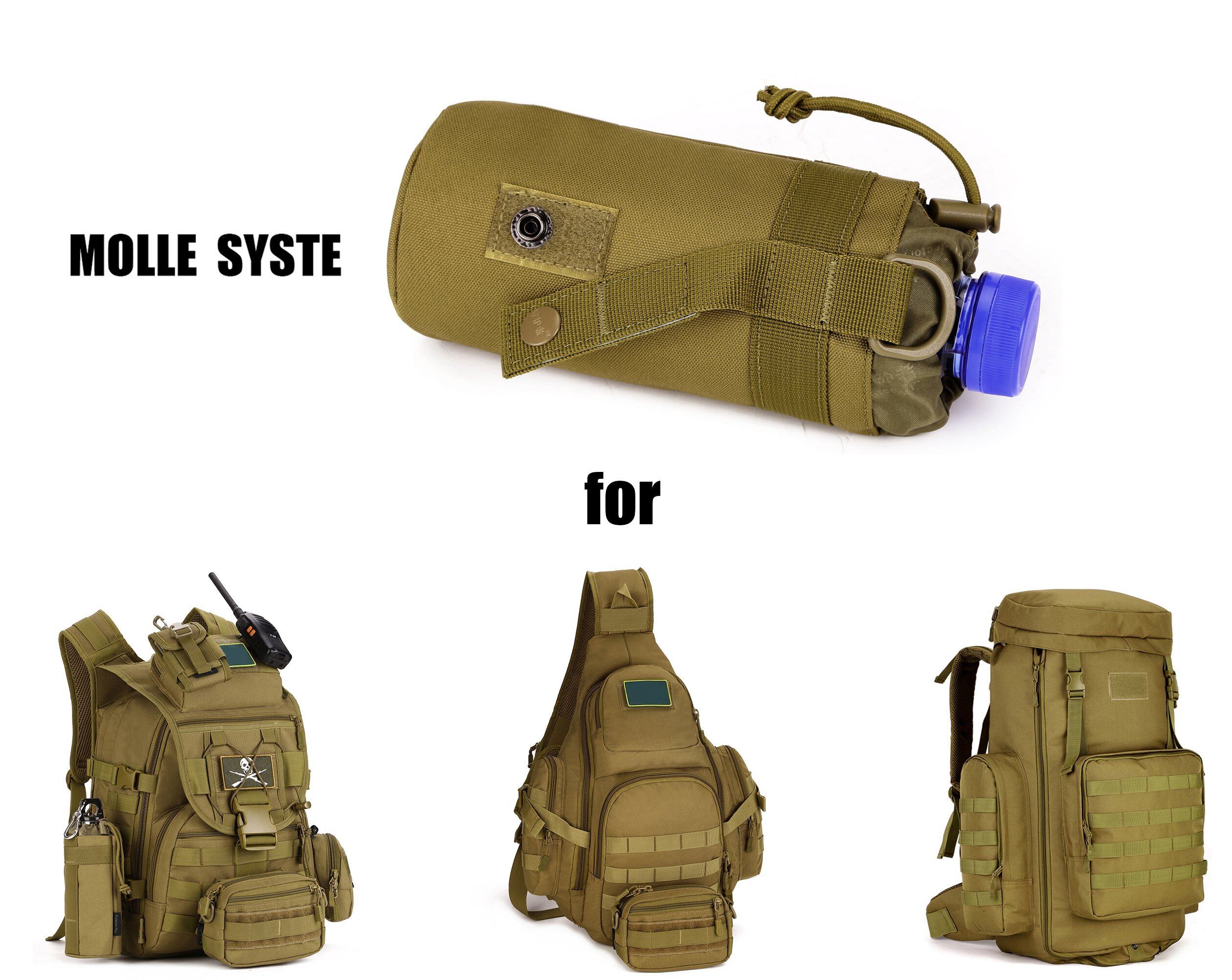 モール適用の550ml水筒カバー:水筒や550mlのペットボトルをすっかりと収納します。MOLLE対応でMOLLEシステムとの接続で、他の大容量のバックパックに負荷をかけることができます。持ち運び楽々。
