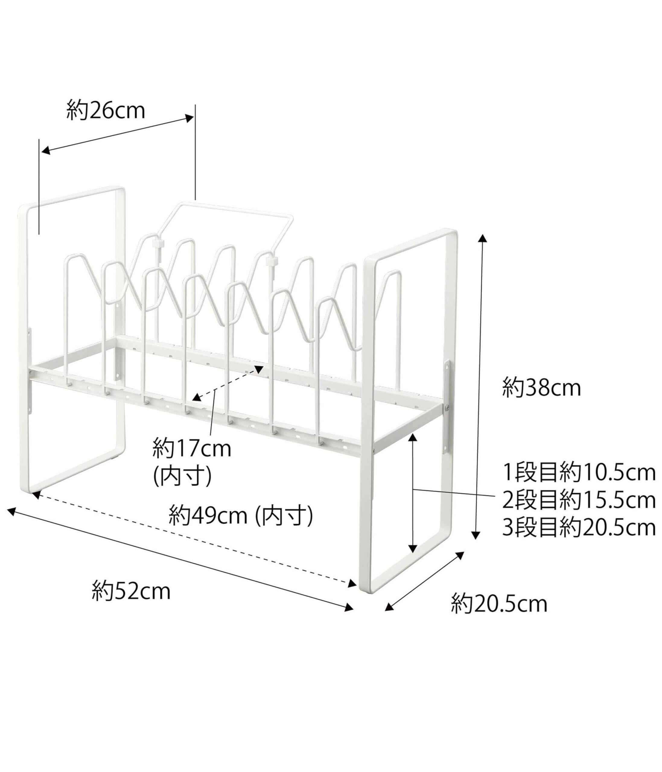 内寸サイズ:1ピッチ約2.5cm(仕切りパーツを含まず)※2ピッチ目から約3cmごとに拡がります。幅/約49cm、奥行/約17cm、下段高さ/1段目約10.5cm・2段目約15.5cm・3段目約20.5cm