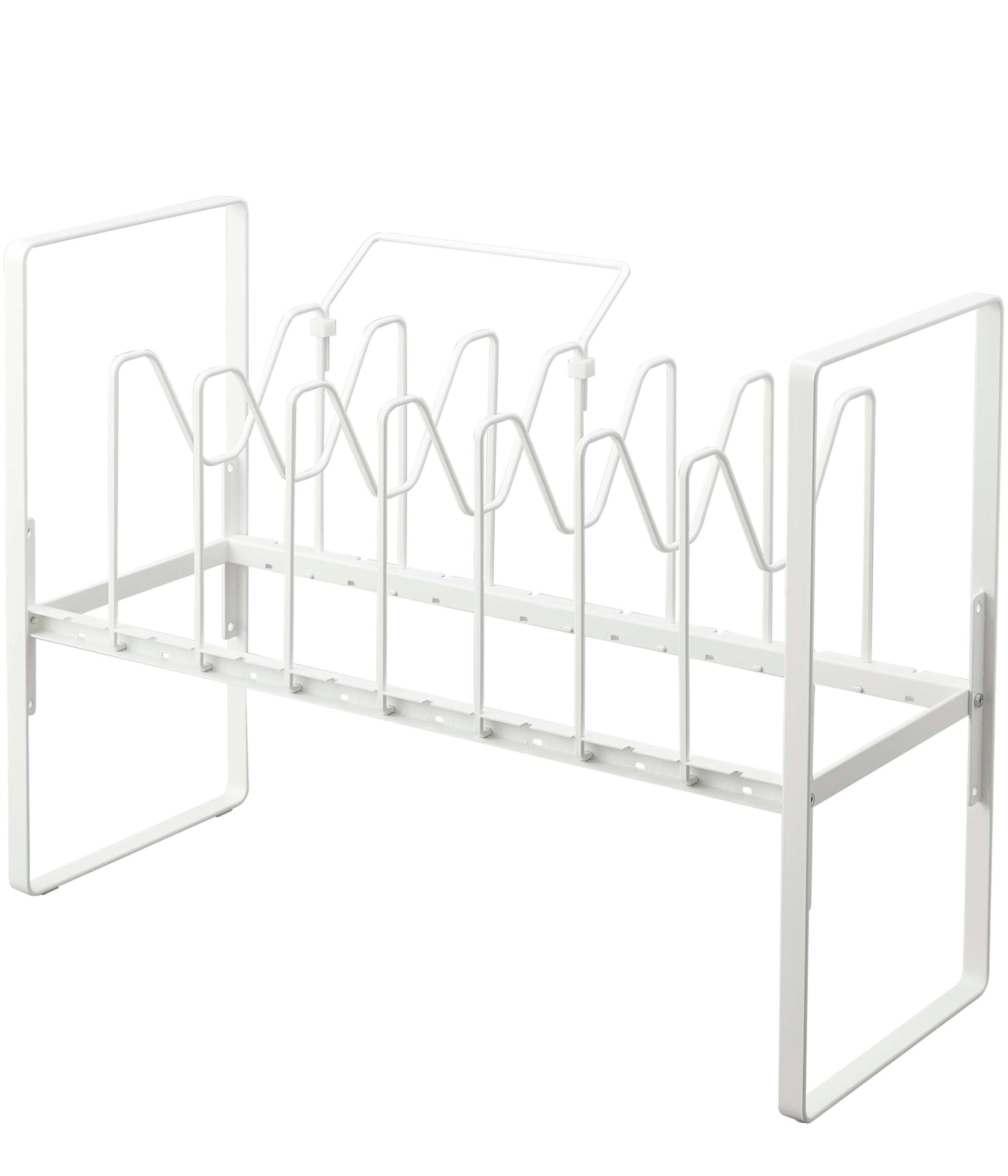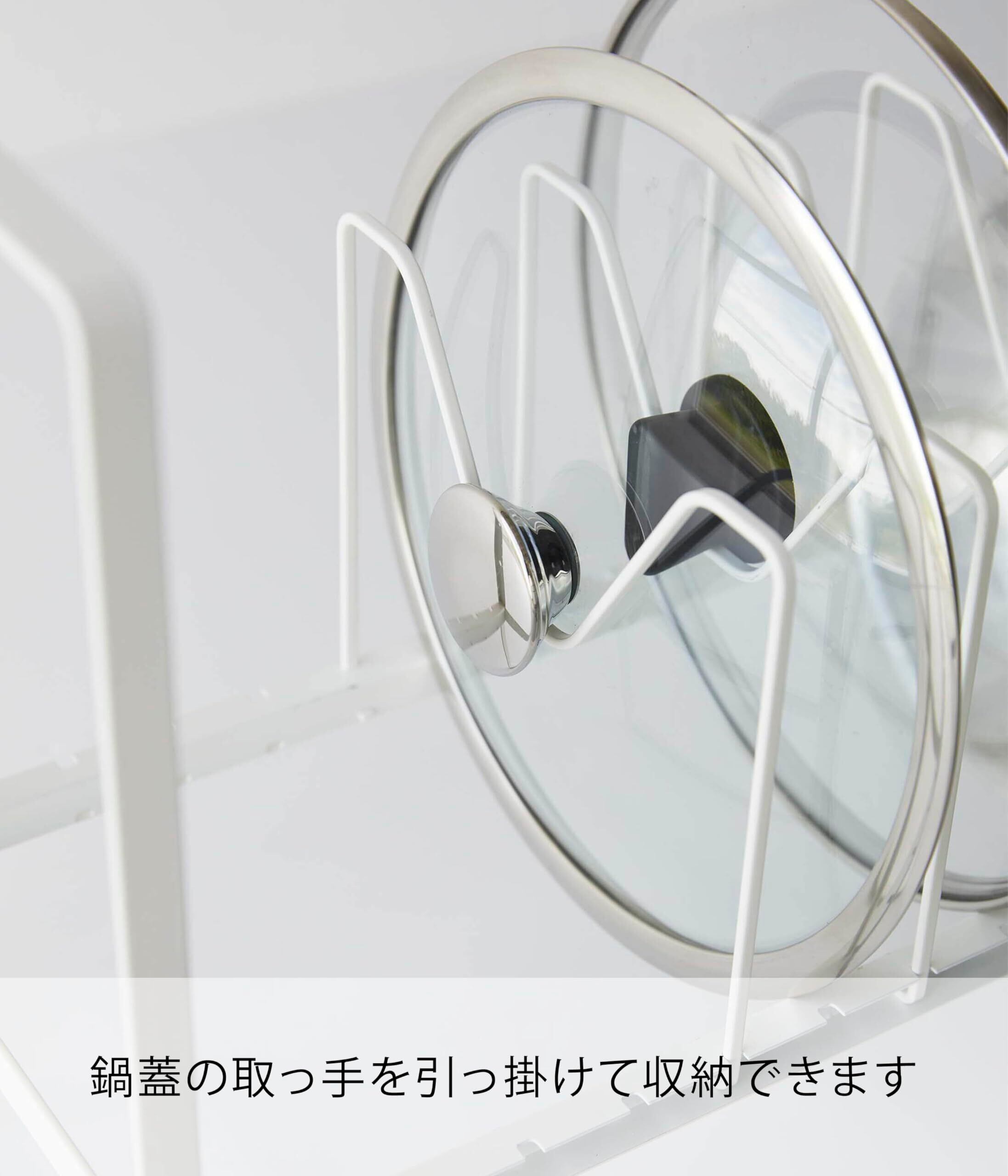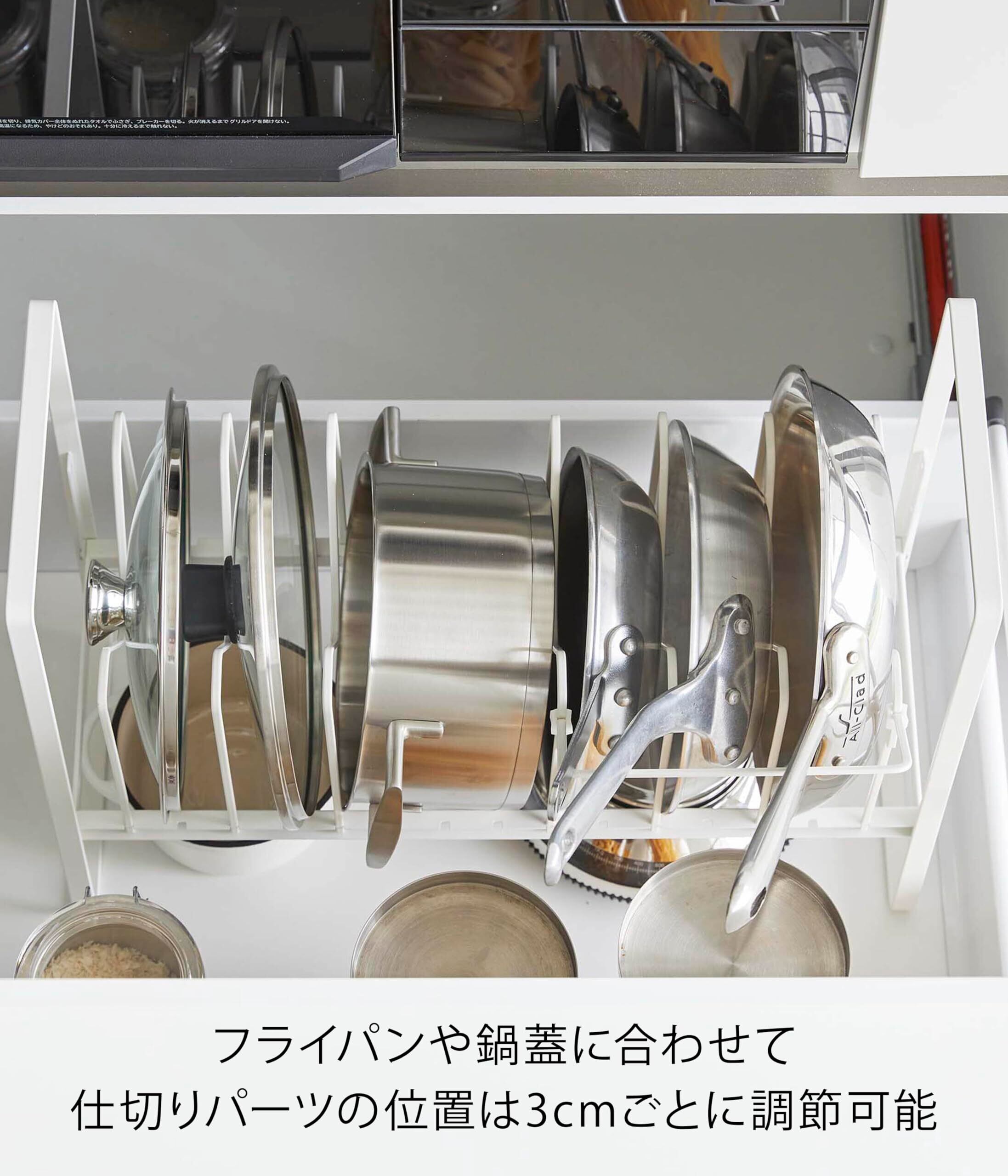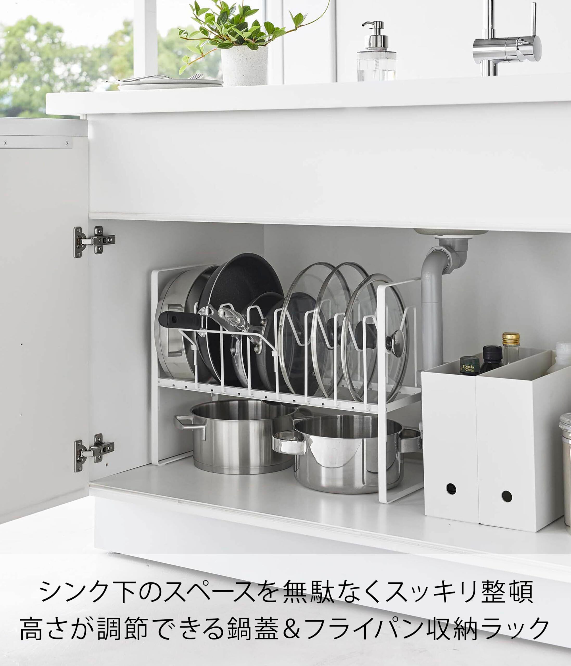 フライパンや鍋蓋を立てて収納でき、高さ調節できるから下のスペースも有効活用!