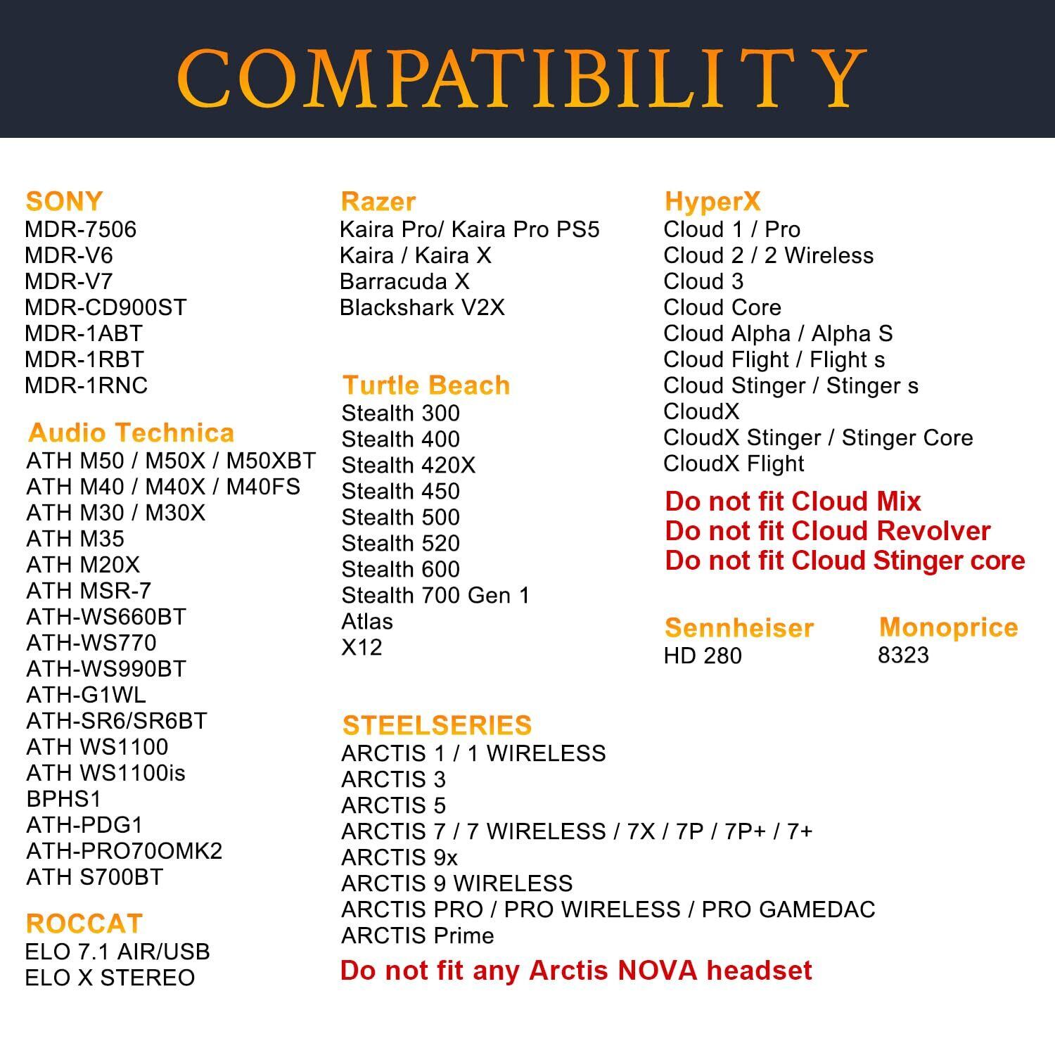【対応機種】:M50X, M40X, M30X, Cloud 1/2/Core/Alpha, Arctis 7, Arctis 7P, Arctis 9, Arctis 9x, Arctis Pro, Arctis Prime wireless, MDR-7506, MDR V6,MDR-1ABT, MDR-RBT, MDR-RNC, Stealth 500, Stealth 600, Stealth 700 などのヘッドフォンと互換性があります。他の型番のヘッドセットと対応可能ですが、写真のリストまでご参考ください。
