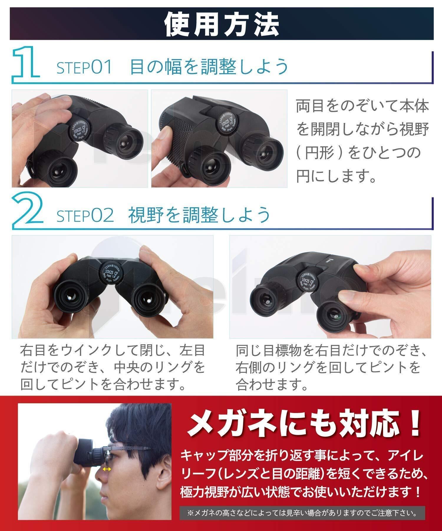 メガネでもOK:眼鏡をかけてコンサートに参加される方もおられます。Preime双眼鏡は目当てを反転させる事ができ、メガネをかけたままでもご利用頂けます。商品到着時に目当ての部分が折れている場合がありますが2日-3日放置すると直ります。【スペック】光学ガラス、ABS樹脂、NBRゴムナイロン、ストラップ付き、軽量設計(ケース+ストラップが付属しております) ひとみ径:2.5 見かけ視界:78° 実視界:7.8° 1000m視界:114m、非ナイトビジョン。製品の製造上、まれにレンズの中にゴミが入る場合や、ピント調節部分に不具合が見られる事がございます。その場合はスムーズに商品のお取替え、返金を致します。