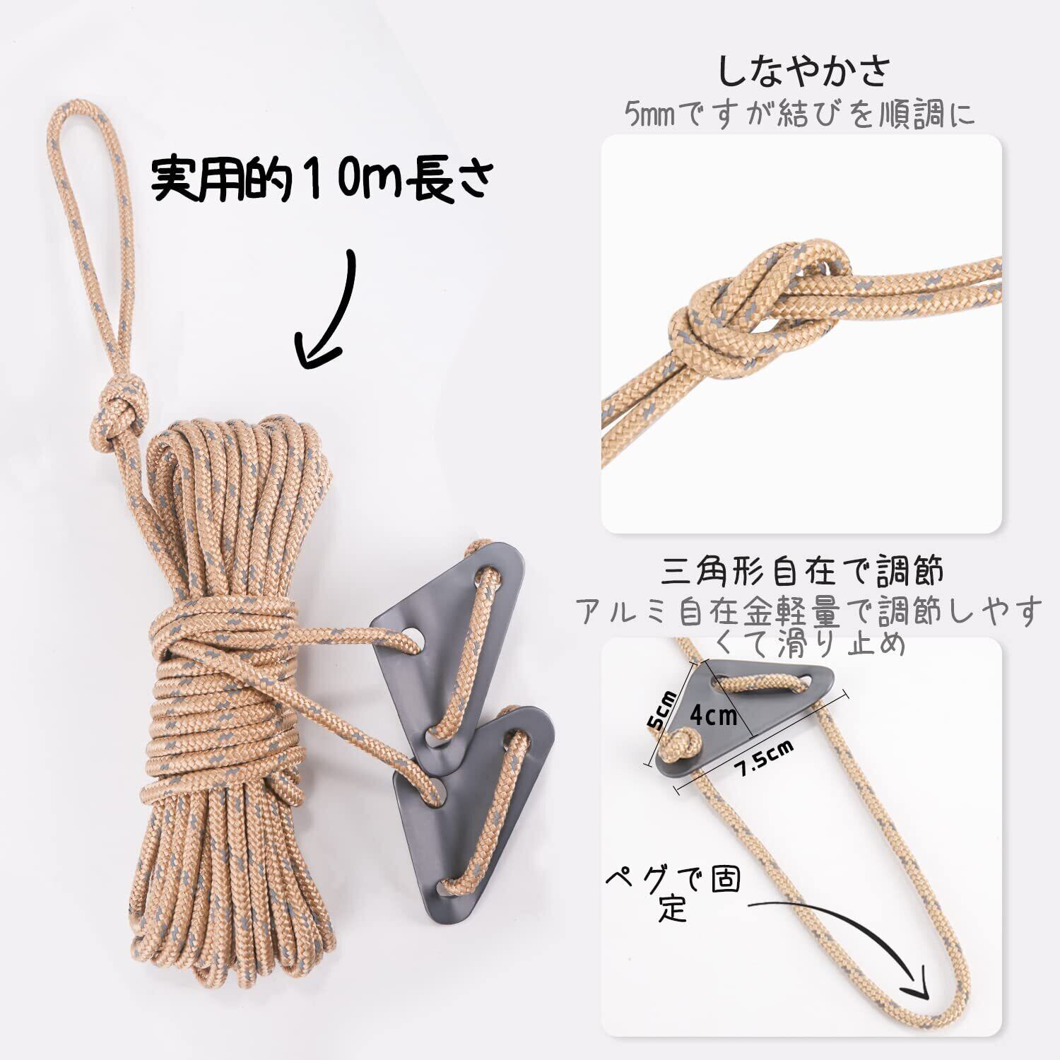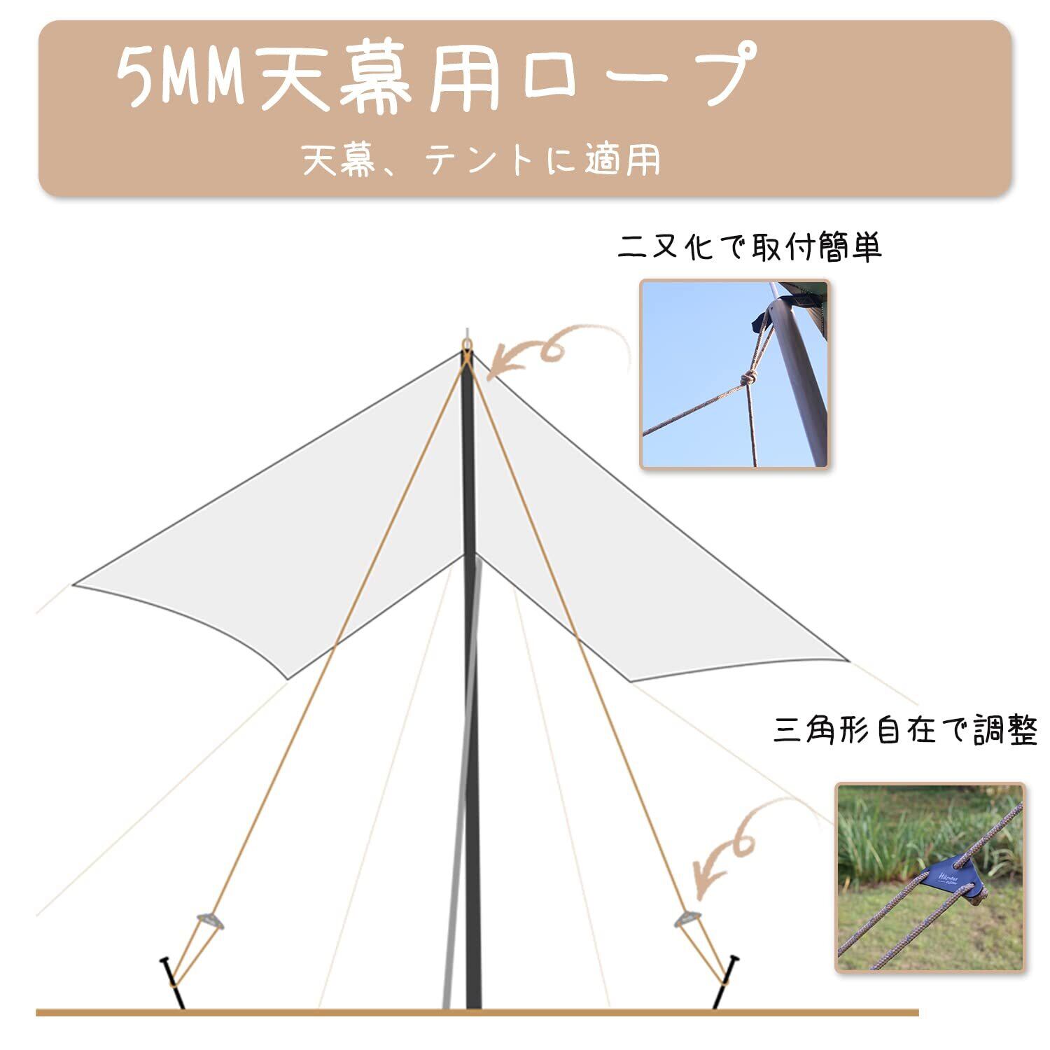 優れた材質と造り:太さは安心感のある5mmで、ガイロープも14本の外芯(カーキの部分)+2本反射材+ 5* 3本の内芯(内部白い部分)から編まれて耐荷重は430kgまで安心します。 自在金具はアルミ合金なので軽量と丈夫性を組み合わせて、表面は陽極酸化処理されており、錆びにくくなって、耐食性と低温に耐性がよいです。