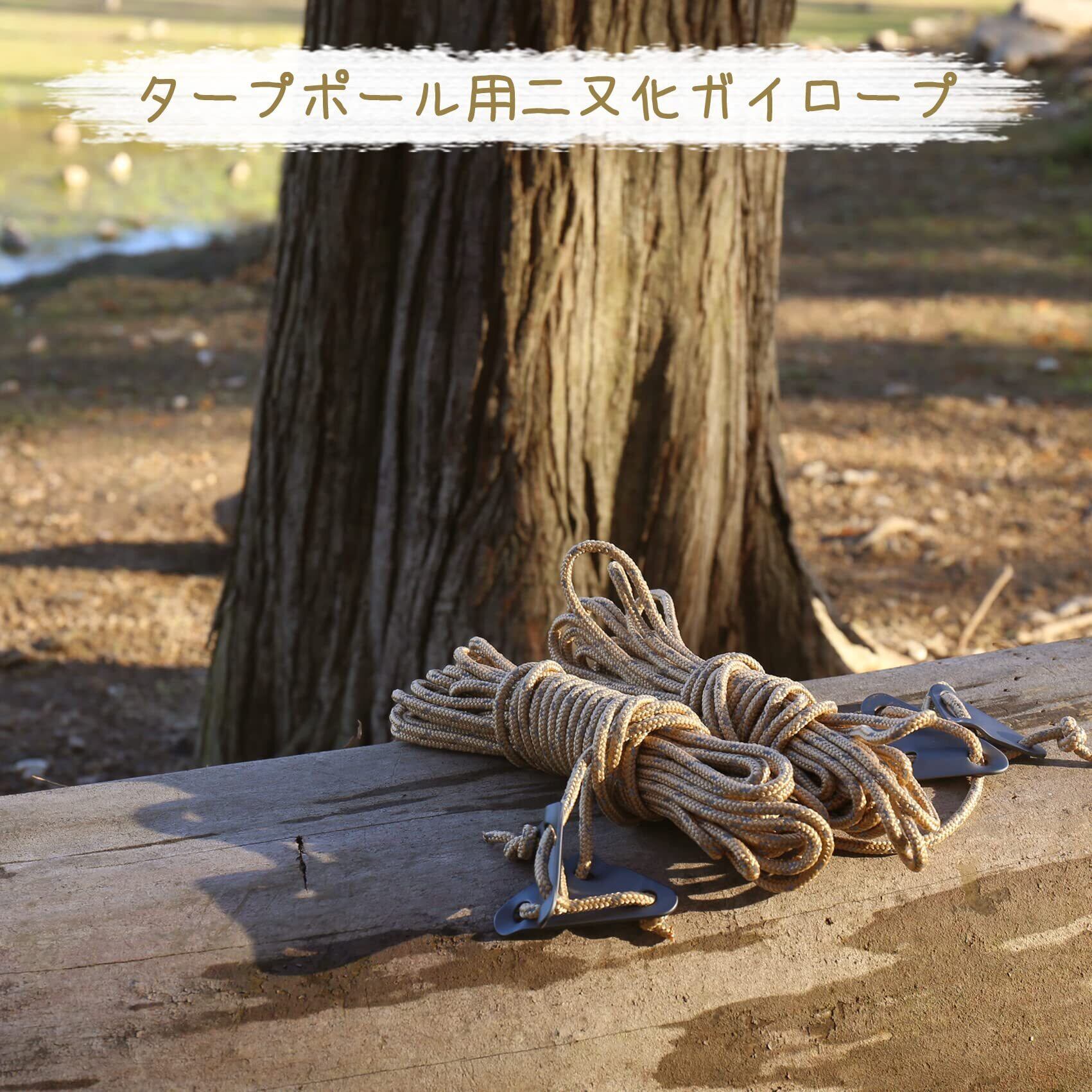 二又化タープロープ:長さ10mで半々に自在結びをしっかりしたら、結びところから二股に分けられという二又化設計が出来ます。 自在結びをタープポールのトップに引っ掛けると二つの4m型にかけがえます。 タープポールを左右両方に支え、三角形になるため力を伝達することができ、固定力が更に強くなります。