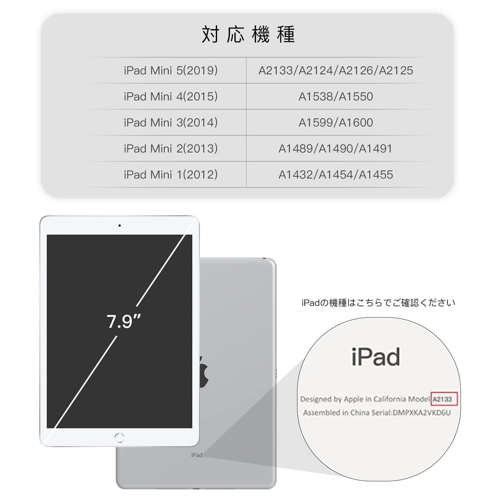 【適用端末】:iPad Mini 5 7.9" 2019 (A2133 A2124 A2126 A2125), iPad mini 4(A1538 A1550), iPad Mini (2012), Mini 2 (2013), Mini 3 (2014) (A1432 A1454 A1455 A1489 A1490 A1491 A1599 A1600);その他の型式に適用されません。