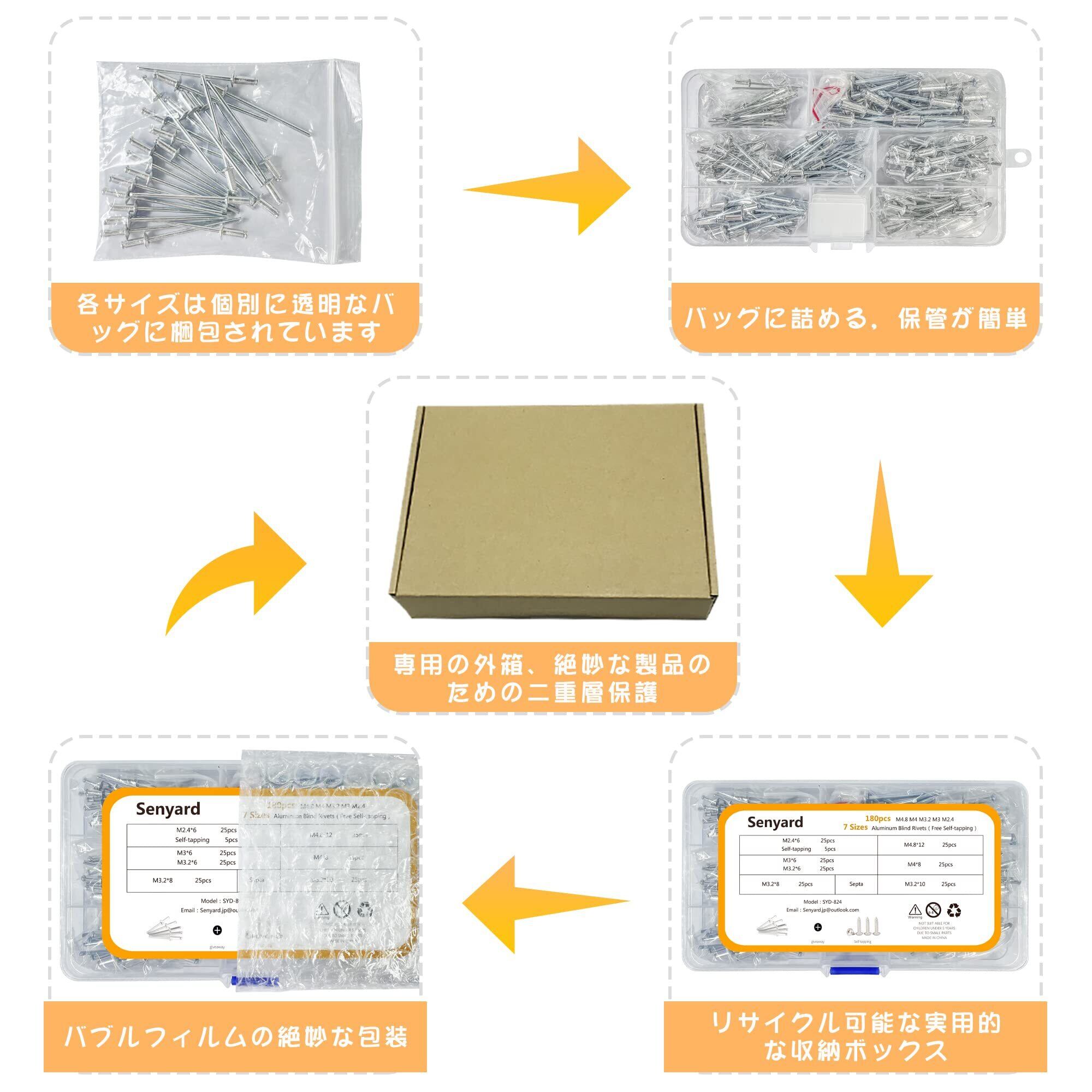 【180個リベット セット 仕様】M2.4*6mm(25個)、 M3*6mm(25個)、M3.2*6mm(25個)、M3.2*8mm(25個)、M3.2*10mm(25個)、M4*8mm(25個)、M4.8*12mm(25個)。ネジ M4 10mm、ネジ M4 20mm、収納ボックスを無料でご用意しております,外出時の持ち運びや管理が簡単です。