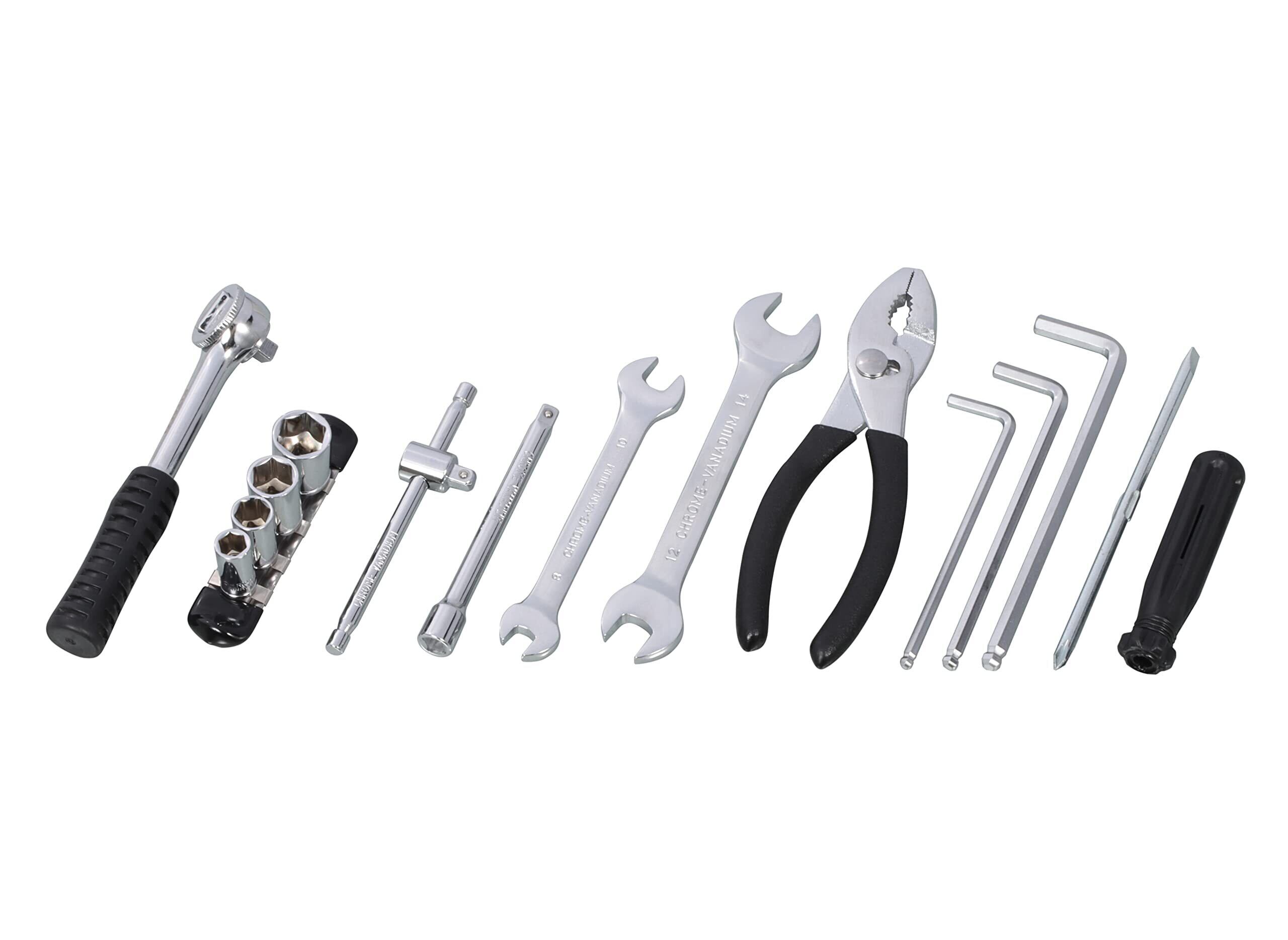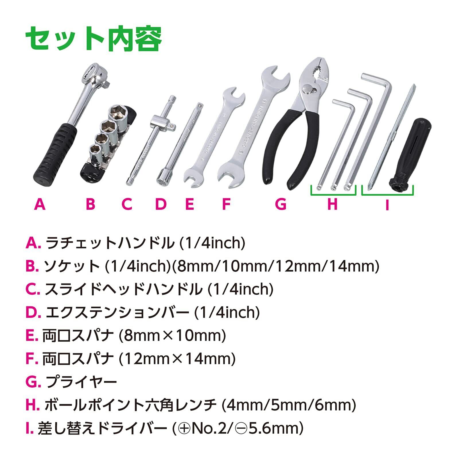 セット内容 ラチェットハンドル(1/4インチ) | ソケット(1/4インチ) 8mm/10mm/12mm/14mm | スライドヘッドハンドル(1/4インチ) | エクステンションバー(1/4インチ) | 両口スパナ(8mm×10mm) | 両口スパナ(12mm×14mm) | プライヤー | ボールポイント六角レンチ(4mm/5mm/6mm) | 差し替えドライバー(⊕No.2/⊖5.6mm)