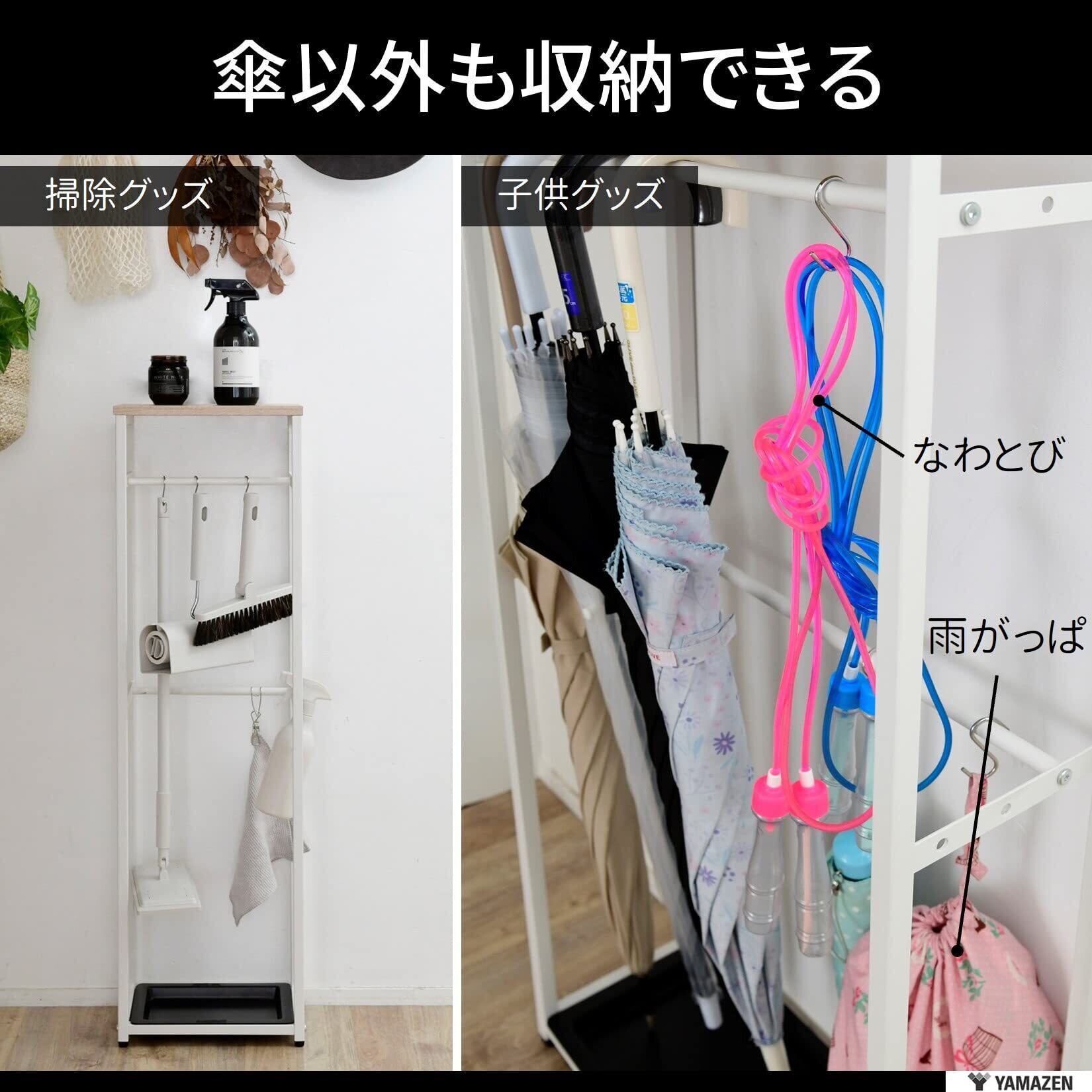 【70cm傘対応】大きめの70cmの傘にも対応しています。傘の他にも、お子様の縄跳びや砂場用の外遊びグッズ、ほうきやちりとりなどの掃除グッズの収納にもオススメです。S字フックが3個付いているので引っ掛けて収納できます。