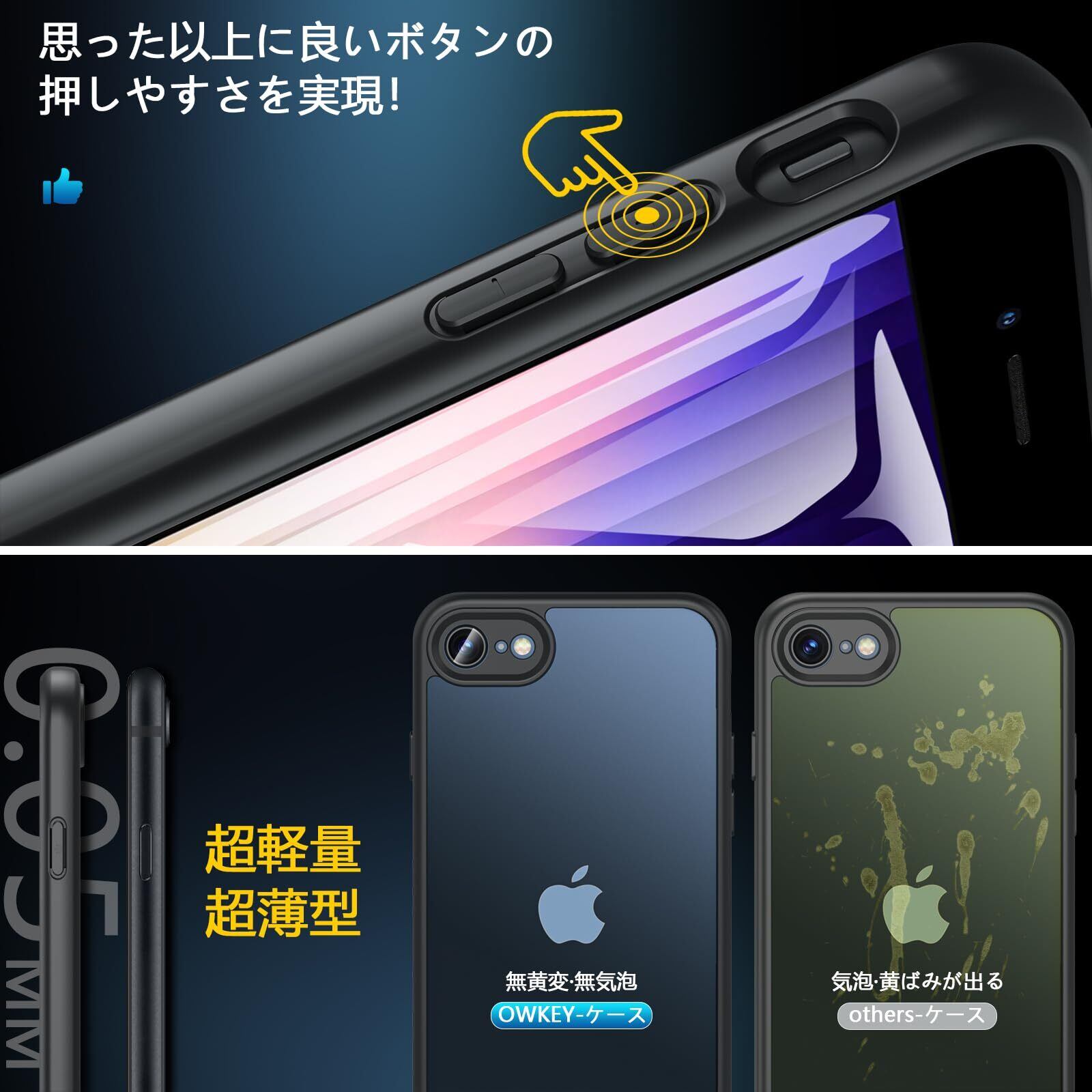 OWKEY iPhone SE ケース iPhone SE3 ケース iPhone SE2 ケース iPhone8 ケース【ガラスフィルム付き】半透明 薄型 軽量 アイフォンse スマホケース 米軍MIL規格 全面保護 耐衝撃 レンズ保護 iPhone7ケース ストラップホール 黄ばみなし 耐久性 iPhone SE2/SE3/8/7 用ケース 4.7インチ ブラック