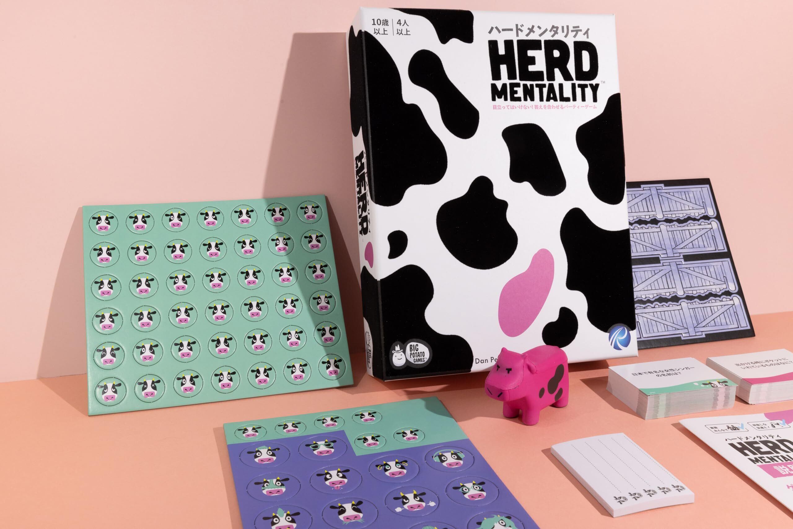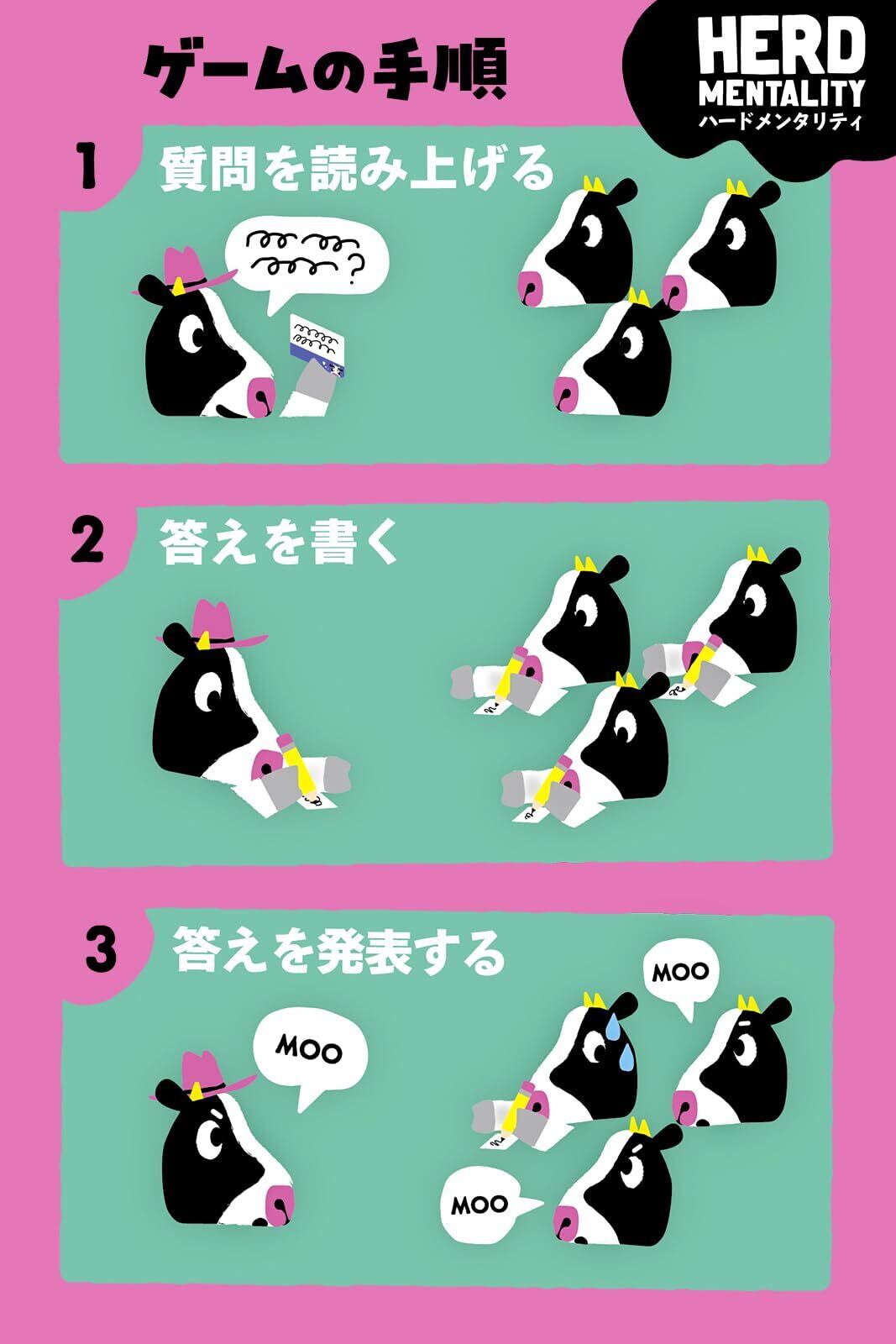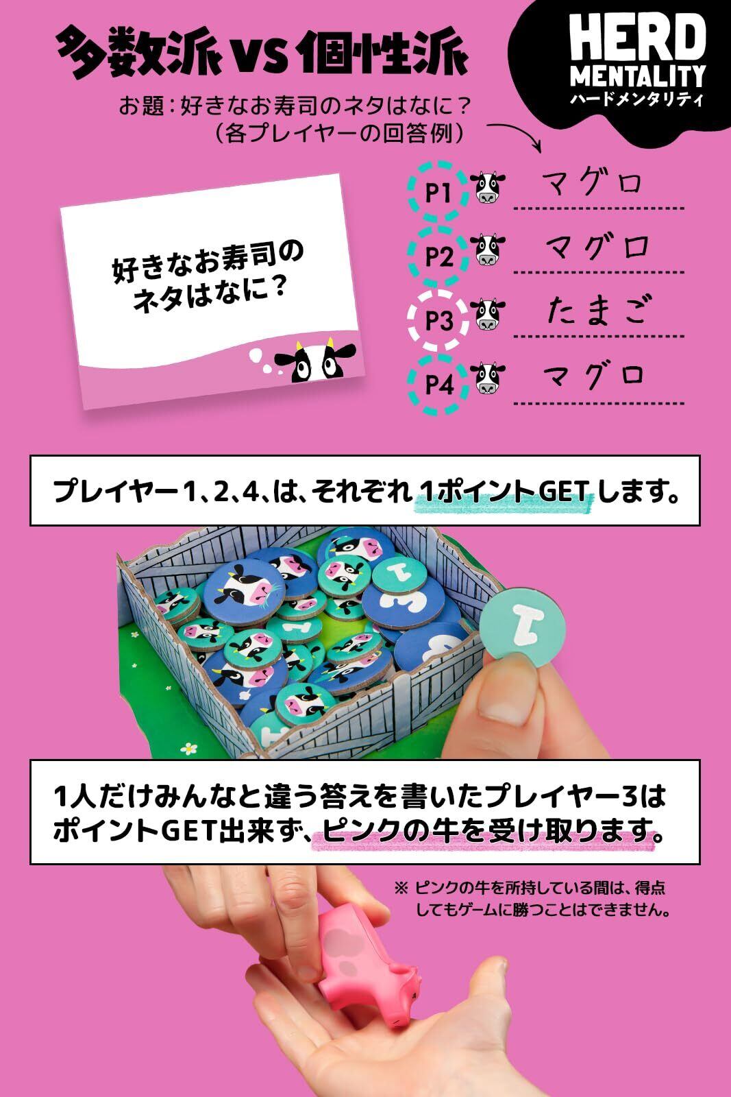 【 みんなの答えと同じになる!? 】プレイヤーはお題に答え、他のプレイヤーと答えと一致させる(多数派になる)ことでポイントを獲得します。最初に8ポイントを獲得した人が勝者となりますが、ユニークな「ピンクの牛」ルールにより、勝利が簡単には決まりません。