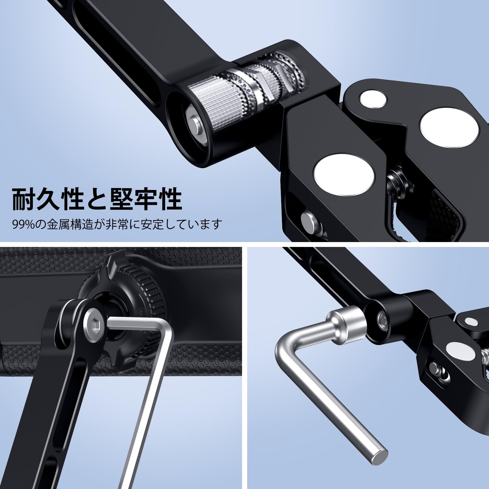 画角調整可能:ブラケットの長腕は270度調整でき、短腕は180度調整でき、端のボールは360度回転できる。接続アームを調整することで、異なる角度要件を満たすことができます。必要に応じて角度を調整し、提供された2つのレンチ(1つのソケットレンチ、1つの六角レンチ)を使用して位置を簡単にロックします。使用中にタブレットが落下する心配はありません。