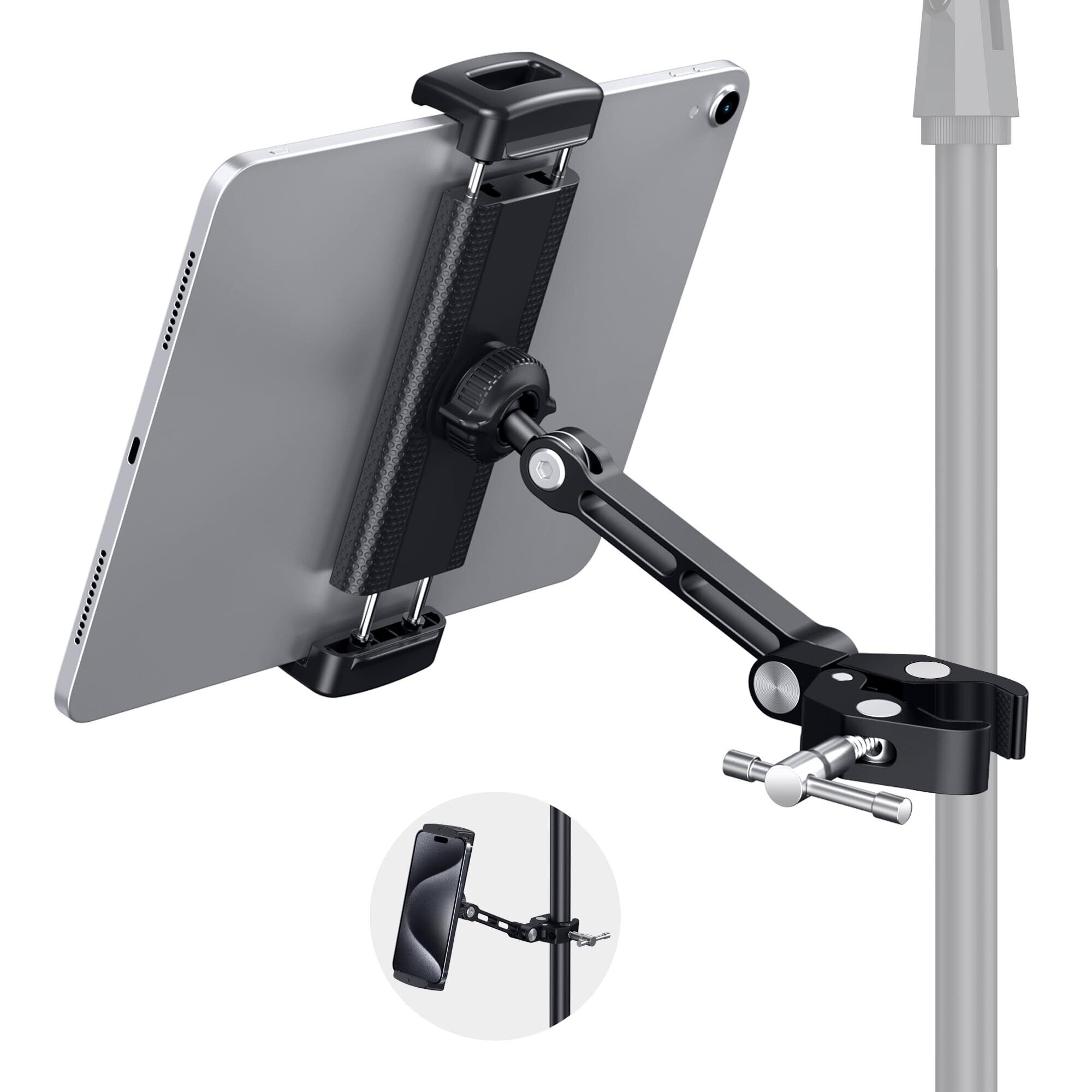 取り付けやすい:クリップを開けて、iPadホルダーをロッドに簡単に接続します。この金属製ブラケットには、直径0.63インチから1.77インチ(16 mm~45 mm)の異なる柱サイズを取り付けることができます。