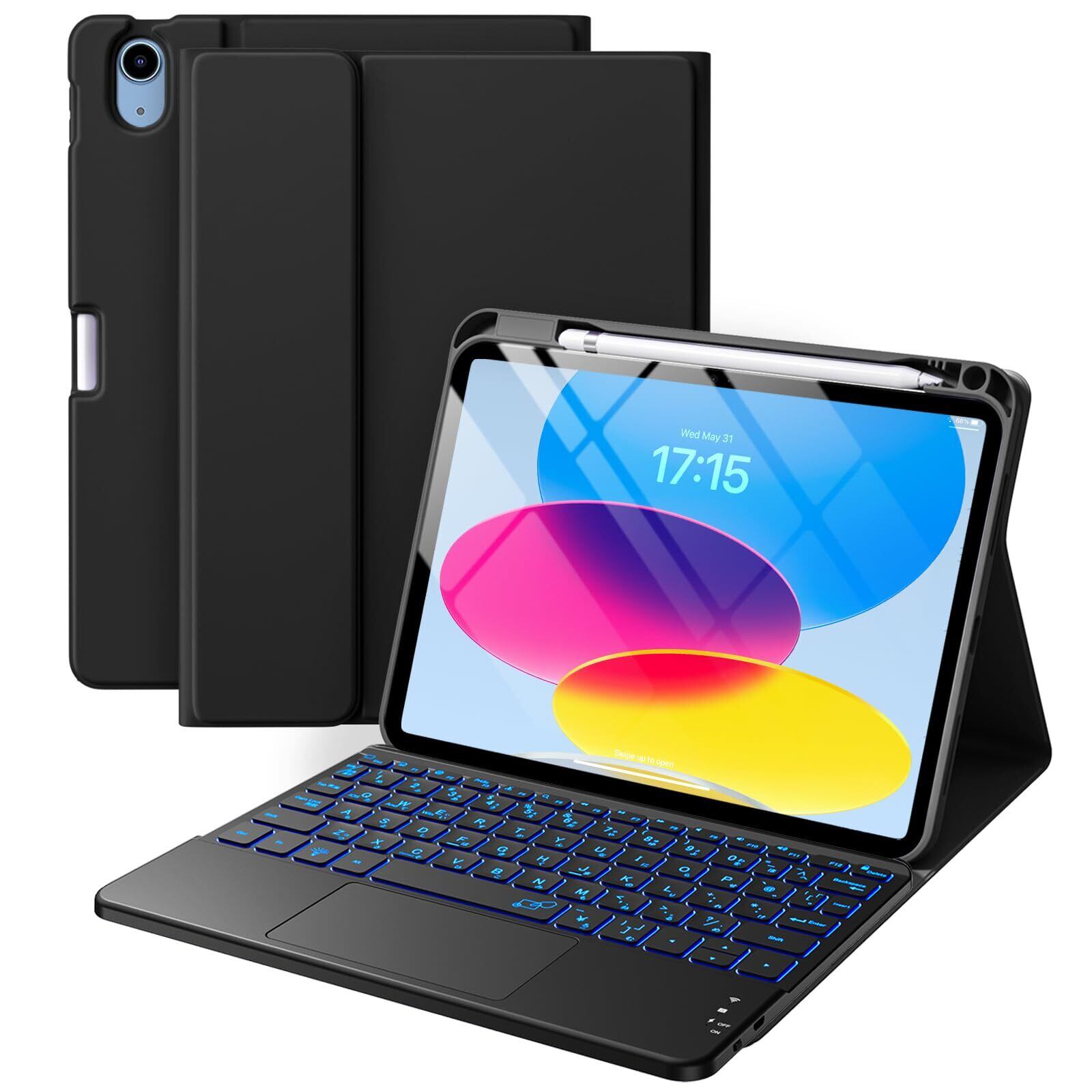HETHOT iPad用 10世代 キーボードケース - 10.9インチ タッチパッド付き 日本語JIS配列 7色バックライト カラーキーボード 防汚素材 脱着式 セミシリコン製 450mah大容量バッテリー Apple Pencilホルダー付き Type-C充電 マグネット式 ケース A2696/A2757/A2777対応 iPad用 10世代 ケース