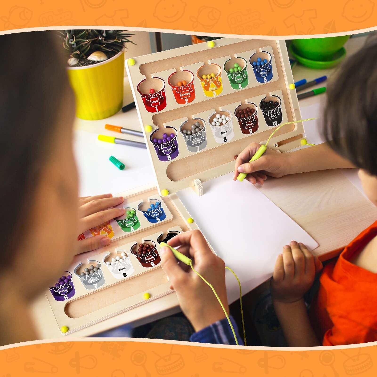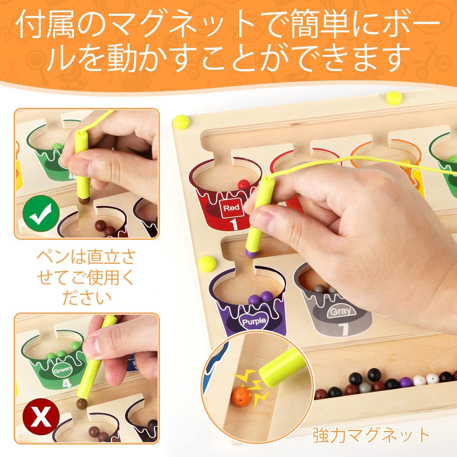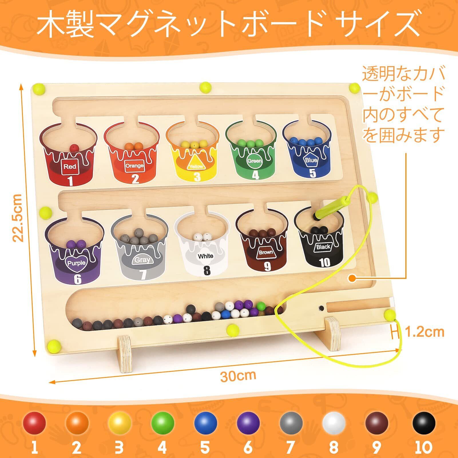 モンテッソーリ 玩具:色を探したり、数を数えるためのマグネット式幼児用ゲーム。木のおもちゃの迷路には、1~10の数字を表す10個の「ペイントポット」と、お子様が数を数えられるように10色の明るい色の65個のマグネットビーズが組み込まれています。3、4 5 6 7歳のお子様への知育おもちゃ的な贈り物として最適です。