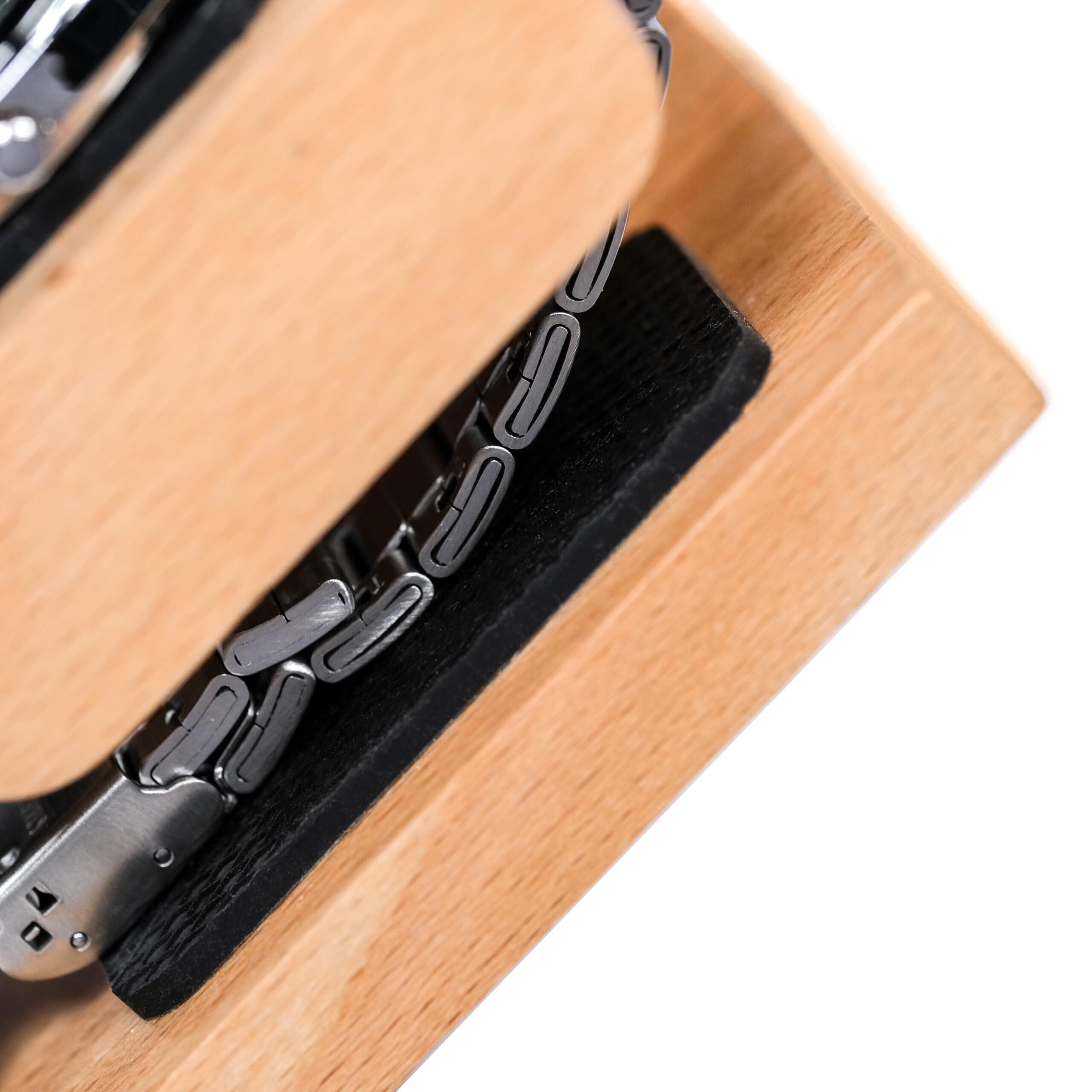 他社品と異なり「時計を傷つけない」のEVOLBER腕時計スタンド。稀少な天然胡桃(ウォールナット)と欅(ケヤキ)の一本買いから、一本一本、創り上げる職人技。ケヤキとウォールナットのなめらか手触りと香りの時計台
