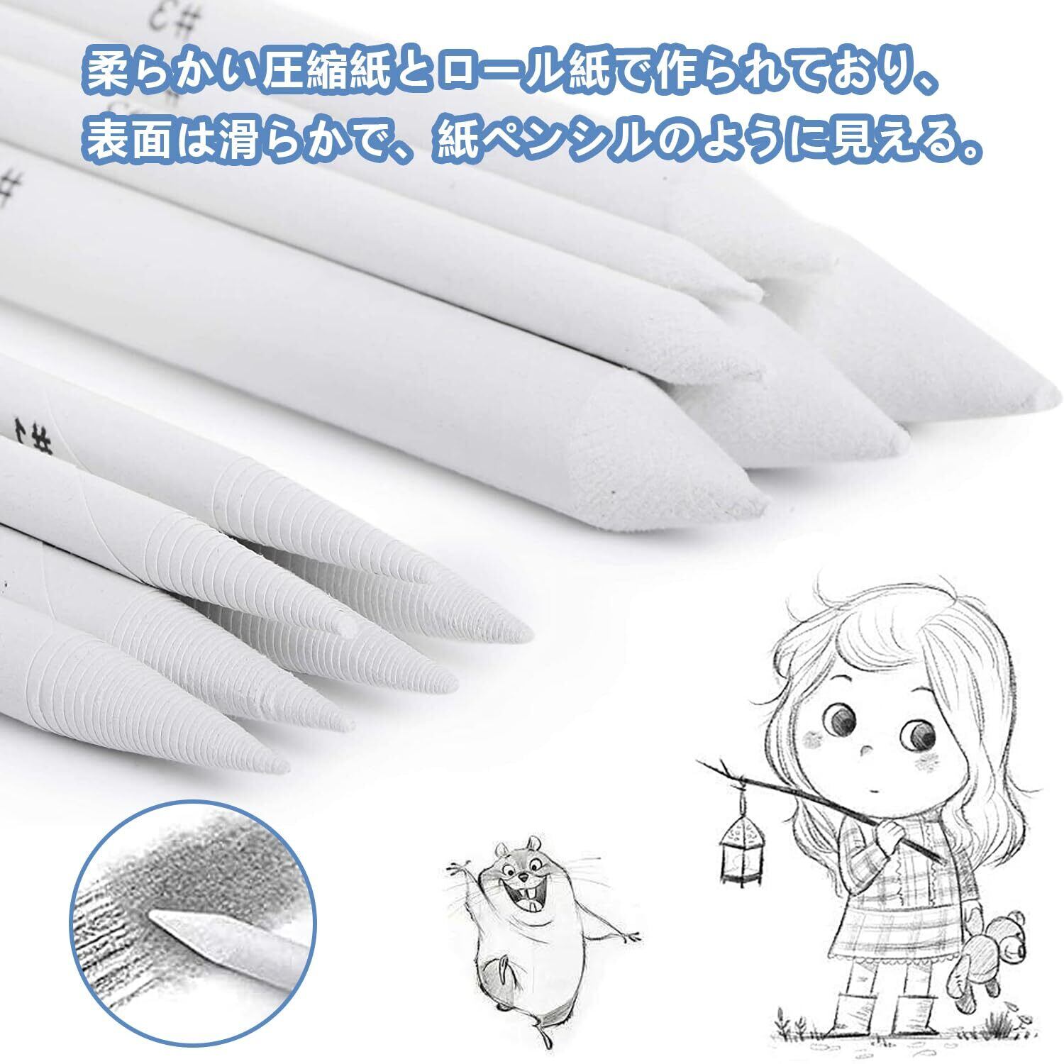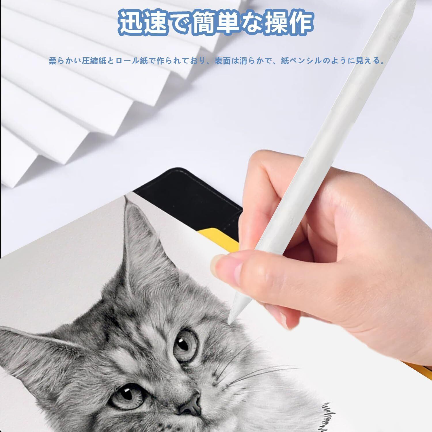 【高品質素材】:上質紙を使用して、しっかり巻いた物です。、繊細な質感だけでなく、適度な硬度があって、双頭が利用されます。さらに繊細な表現が可能です。デッサン、パステル画の調子を整える時に、指の代わりに木炭や鉛筆、コンテ、パステルなどのぼかしや混色に使用します。