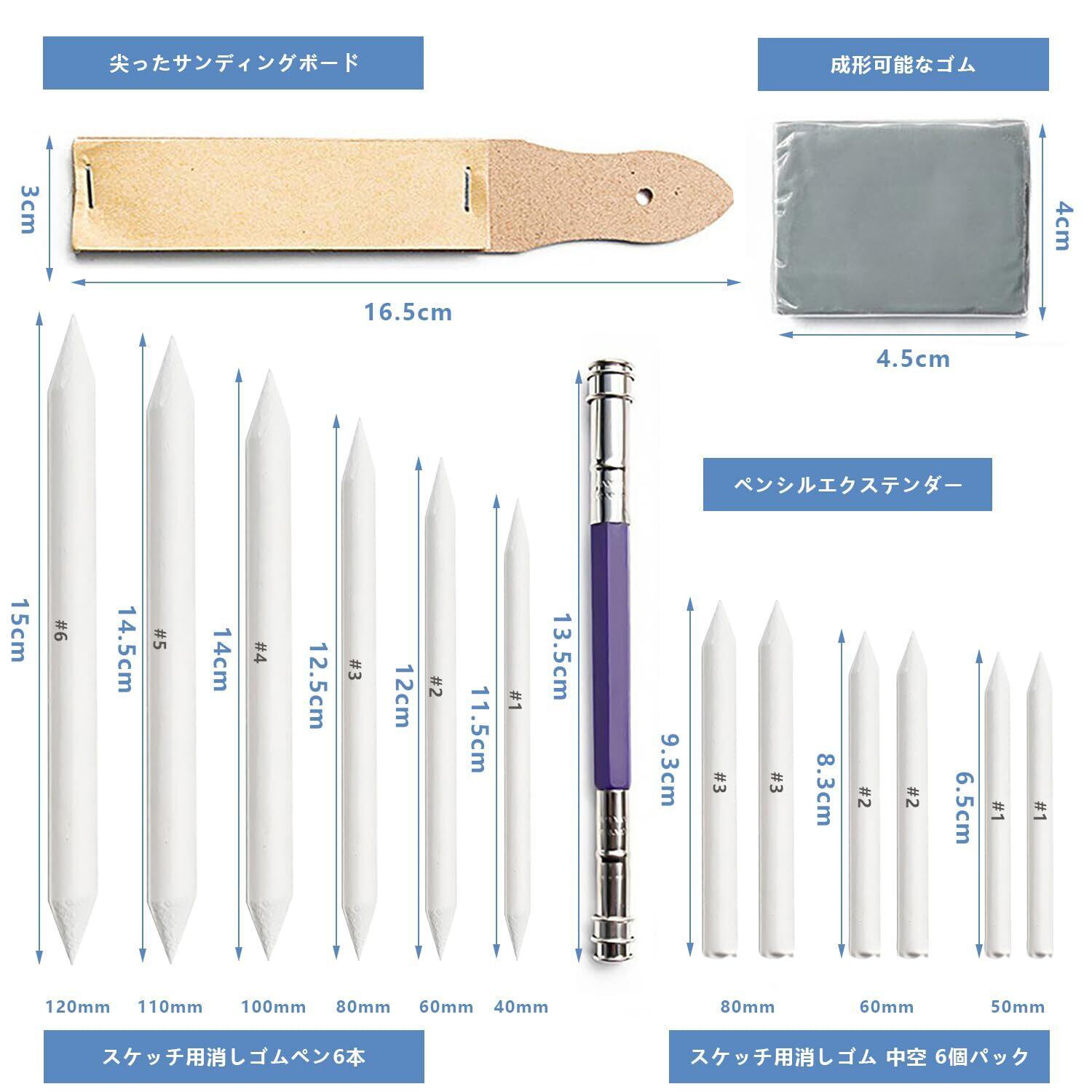 【パッケージに含まれるもの】 硬いサッピツ6本(#1/#2/#3/#4/#5/#6)、柔らかいサッピツ6本(#1/#2/#3各2本)、紙ヤスリ1本、鉛筆補助軸1本、成形可能イレーザー1個計15点セット入。