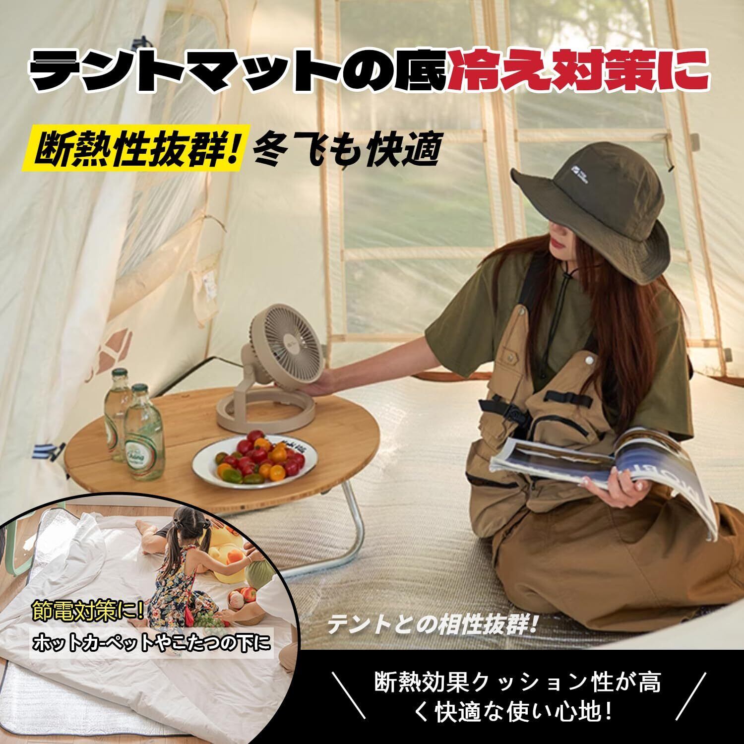 【保温性、断熱性が抜群です】また、炎天下では光を反射し高温を防ぐ効果もあり、アルミシートは水や汚れを強力にはじく撥水加工が施されているため、濡れた地面や草の上に敷いても、雨や汚れ、水分を弾いてシャットアウトし、長時間座
