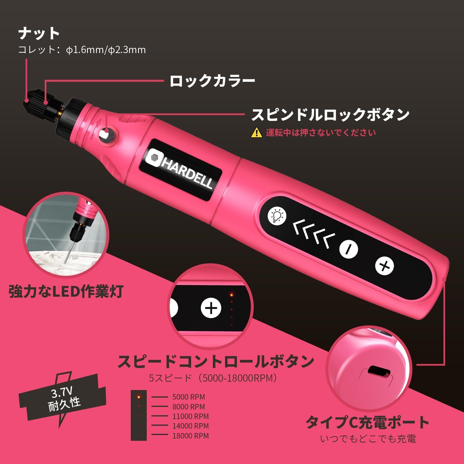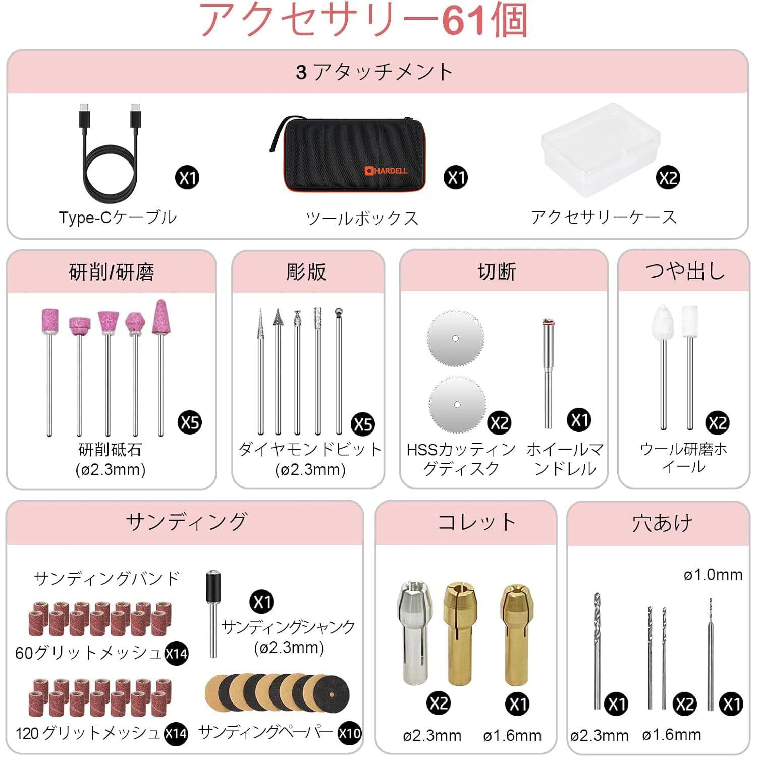 【在庫処分】HARDELLミニルーター 5段変速 61PCS 18000RPM高速回転 USB充電式ミニ工具セット ルーターツール 電動 軽作業に適した 無線研磨/ポリッシュ/穴あけ/切断/除錆/彫刻/DIY/ネイルスタジオ 照明付き充電式ルーター 日本語取扱い説明書(ピンク) | gsmshop
