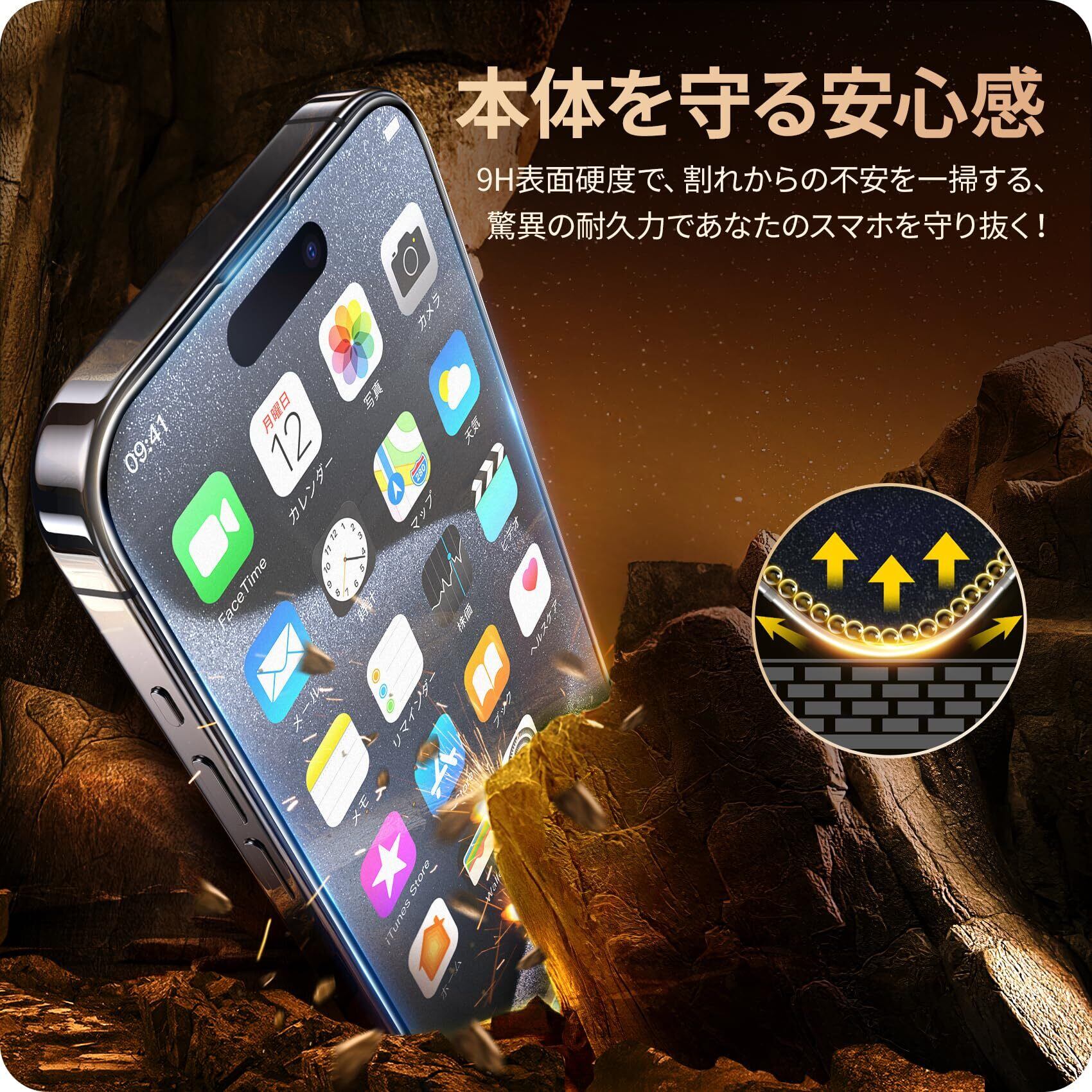 【黒縁全面保護・耐衝撃性アップ】黒縁取りでスマートフォンの画面をフルカバーして、落下や衝撃による損傷からスマートフォンを守ります。9H表面硬度ガラスを採用し、スマートフォンがカバンの中で、鍵などの鋭いものにぶつかっても傷が付きにくく、アイフォン 15 プロ マックス の画面をしっかり保護します!また、飛散防止加工により、万一割れてもガラス破片が飛び散ることなく安心です。
