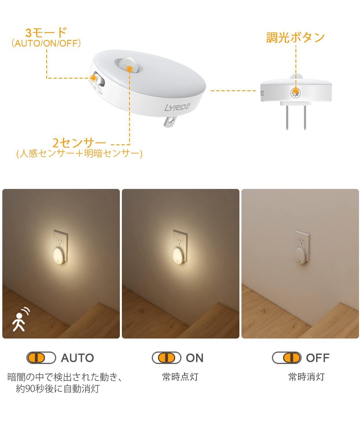 Lyridz LEDセンサーライト 足元灯 コンセント 人感センサーライト 室内 常夜灯 1〜120ルーメン無段階調光 省エネ フットライト 3モード 廊下 玄関 階段 電球色 【2個セット·PSE取得済·日本語取説】