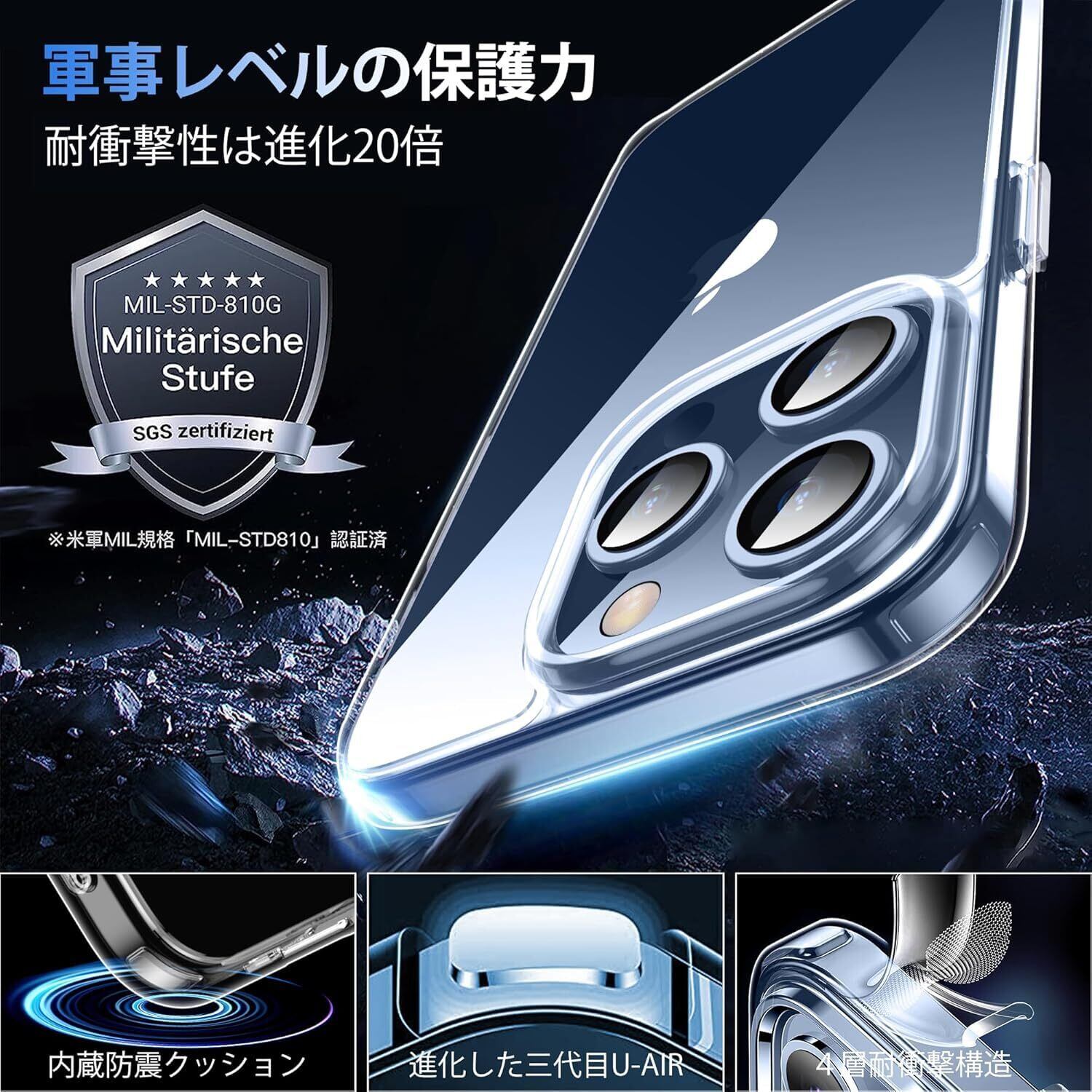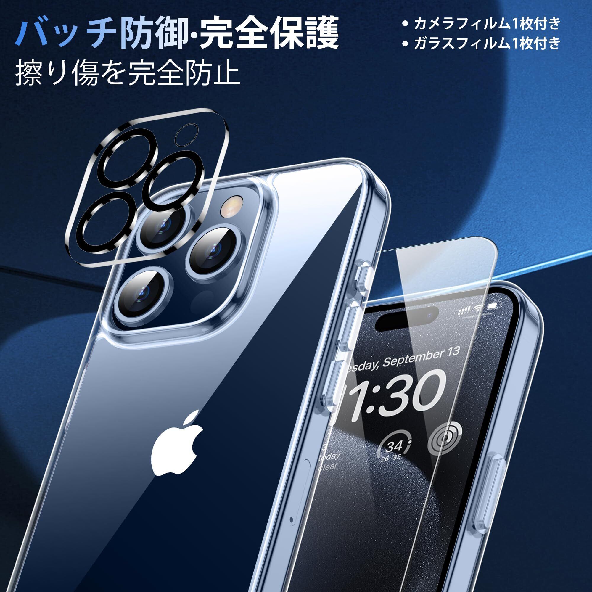 XIWXI iPhone15Pro 用 ケース クリア 耐衝撃 カメラレンズ保護付き アイフォン15Pro用 米軍MIL規格 ストラップホール付き 耐久性 黄変防止 アイホン15プロ用 ワイヤレス充電対応 あいふぉん15Pro用 SGS認証 スマホケース カバー