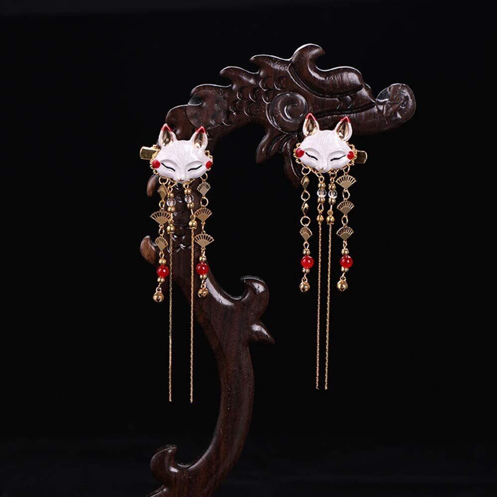 キツネ タッセル 髪飾り 2個セット 扇 ヘアクリップ ヘアアクセサリー 漢風 中華風 漢服 和装 浴衣 着物に適用