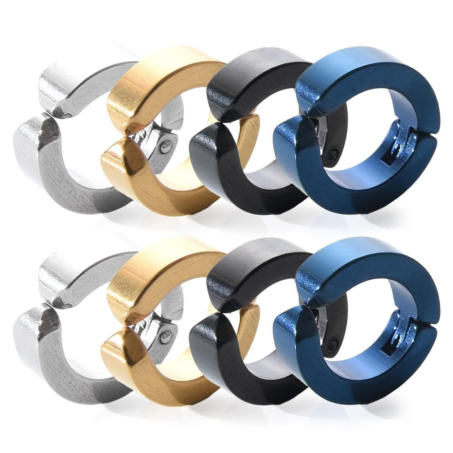 【 選べるカラー 】シンプルでどのファッションにも合わせやすい定番のフェイクピアス・イヤーカフはシルバー・ブラック・ゴールド・ブルーの各色2個セットと各カラー2個ずつの8個セットのマルチカラーからお選びいただけます。フープイヤリングのサイズは直径14mm 厚さは約4mm 重さは約2グラムになります。フェイクピアスはメンズだけではなく、レディースにもお使いいただけます。
