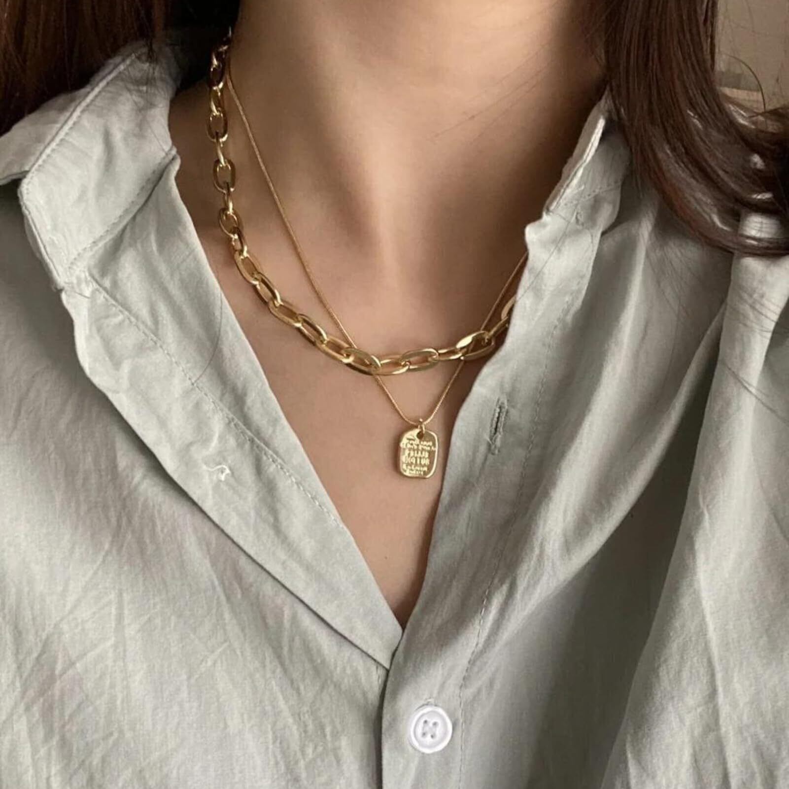 太めと細メ、デザインにメリハリのある2種類の ゴールドチエーンネックレスを重ねつけして、顔まわりにちょっぴり迫力ぷらす。
